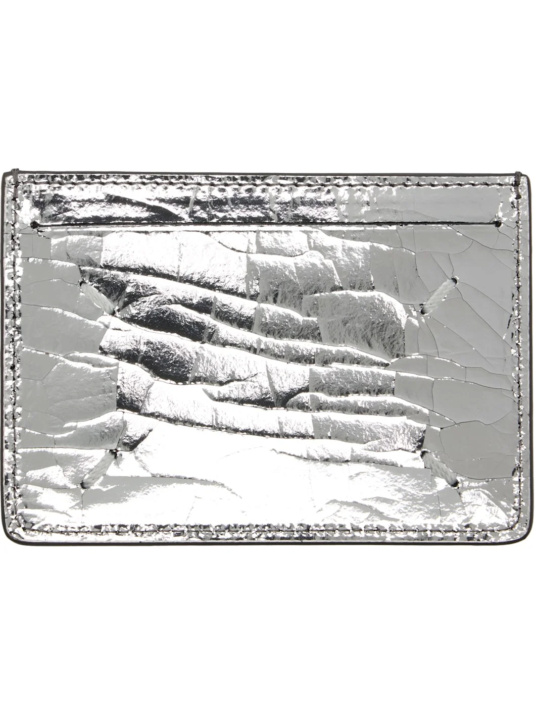Cracked patent calfskin card holder. · White stitching at back face · Two card slots · Central note slot · H3" x W4" Supplier color: Silver Calfskin. Made in Italy 252168M163035