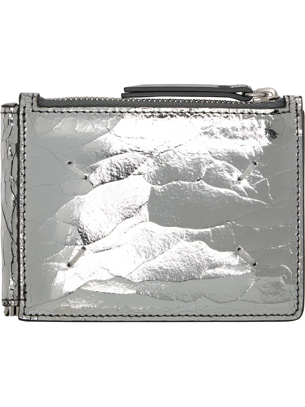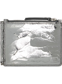 Cracked patent calfskin bifold wallet. · White stitching at face · Three card slots at back face · Zip coin compartment · Money clip at interior · H3.25" x W4.5" D0.75" Supplier color: Silver/Black Calfskin. Made in Italy 252168M164022