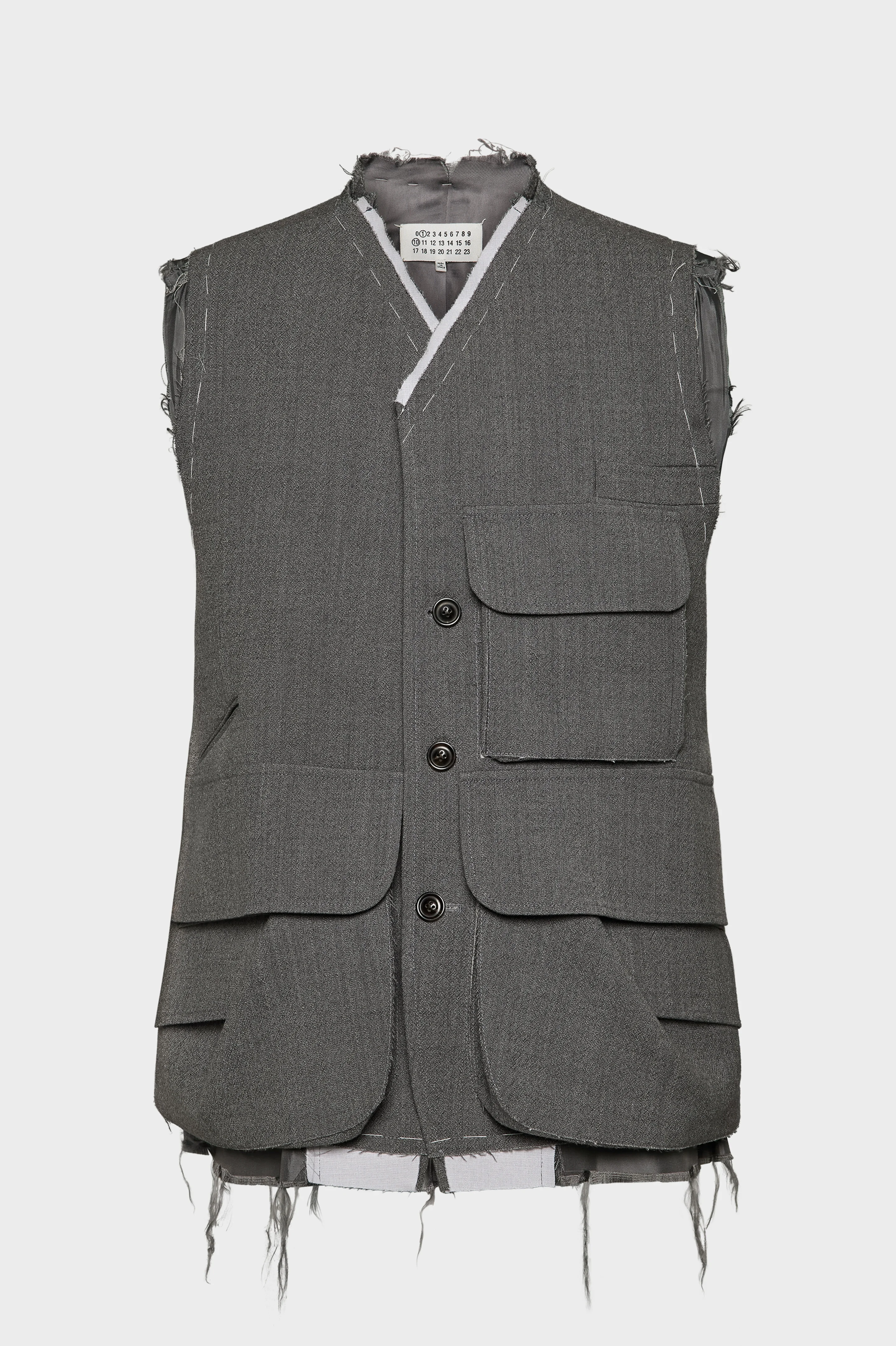An example of the Maison’s work-in-progress approach, the sleeveless jacket is crafted from wool and features distressed edges and tack stitching. With a single-breasted, V-neck design, the jacket has a utilitarian focus with multi asymmetric pockets including a large flap pocket at the back. Maison Margiela's signature, the four stitches, appear at the back; the opposite of a label. Product Details Item ID S50FB0109M35414854M Primary Fabric: 100% Wool Lining: 63% Acetate 37% Viscose-Rayon Pocket Lining: 100% Cotton Wool vest Sleeveless Raw, unfinished edges Three front buttons Multiple flap pockets on the chest and waist Deconstructed look with visible seams and layered fabrics Four stitches at the back Made in Italy Model is 188 cm tall and wears a size 46.