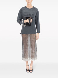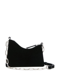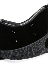small Snatched leather shoulder bag Maison Margiela's Snatched shoulder bag captures the label's avant-garde style through its arched, asymmetric shape. This iteration is crafted in Italy from black velvet, featuring a crystal-embellished front handle that gives a name to the design. The iconic four-stitch logo appears on the front, providing the finishing touch. Highlights - Black - Goatskin - Velvet - Crystal embellishment - Signature four-stitch logo - Perforated detailing - Front handle - Adjustable detachable shoulder strap - Top zip fastening - Main compartment - Full lining Made in Italy Composition Lining: Goat Skin 100% Outer: Crystal 100%, Viscose 65%, Cupro 35% SIZE & FIT Measurement DEPTH 1.96 in(5 cm) HEIGHT 5.31 in(13.5 cm) STRAP 22.44 in(57 cm) WIDTH 7.28 in(18.5 cm)