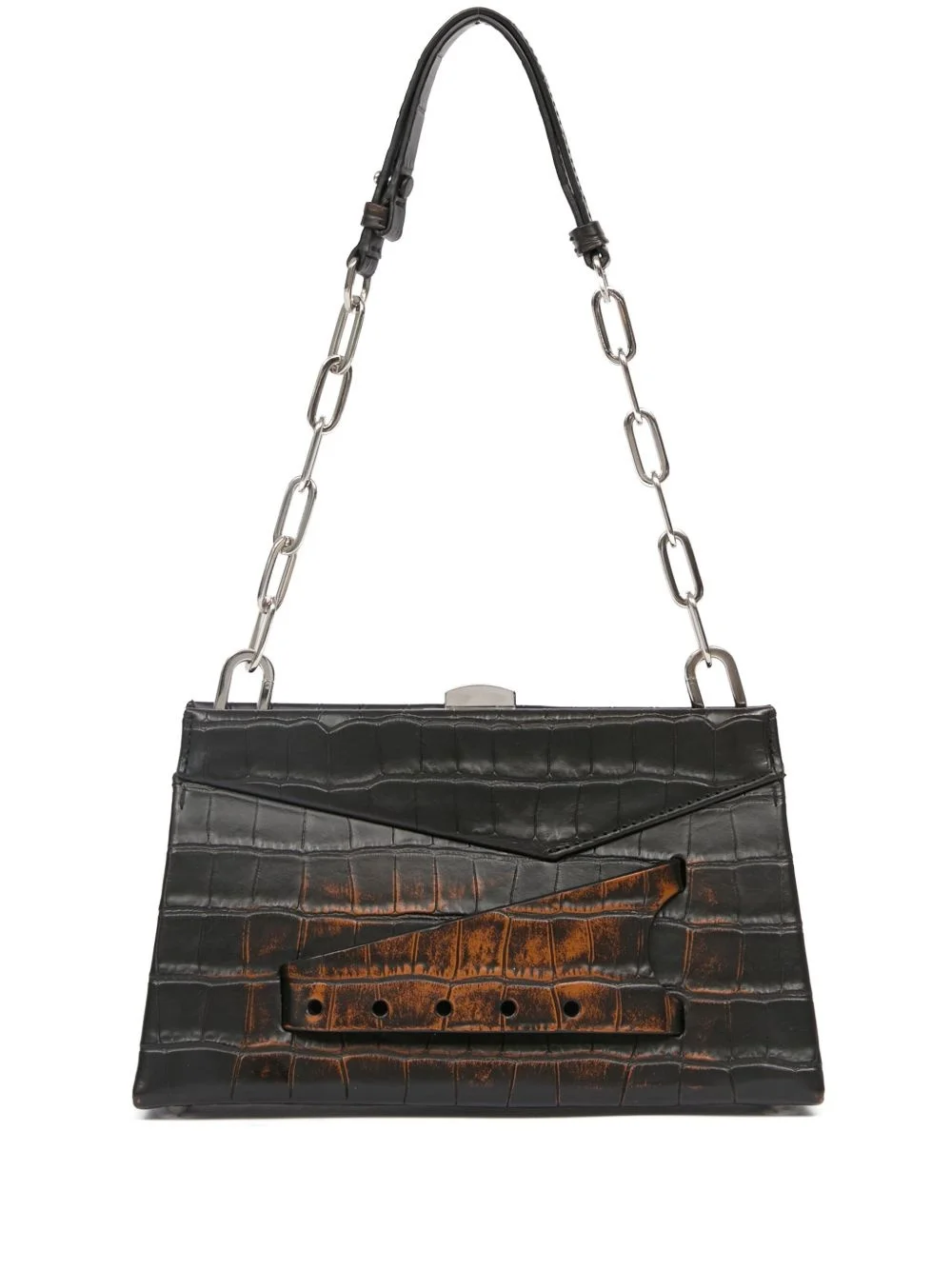 small Snatched shoulder bag Highlights - Black - Calf leather - Embossed crocodile effect - Distressed effect - Push-lock fastening - Chain-link shoulder strap - Front handle - Signature four-stitch logo - Main compartment Made in Italy Composition Outer: Calf Leather 100%
