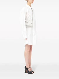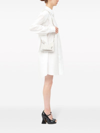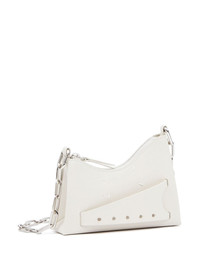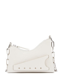 Snatched leather mini bag Maison Margiela's Snatched bag captures the label's avant-garde style through its arched, asymmetric shape. This micro iteration is crafted in Italy from white grained leather, featuring the perforated front handle that gives a name to the design. The iconic four-stitch logo appears on the front, providing the finishing touch. Highlights - White - Calf leather - Grained texture - Signature four-stitch logo - Perforated detailing - Front handle - Silver-tone hardware - Detachable chain-link shoulder strap - Top zip fastening - Main compartment - Full lining Made in Italy Composition Outer: Calf Leather 100%, Metal 100% Lining: Polyester 100% SIZE & FIT Measurement DEPTH 1.96 in(5 cm) HEIGHT 5.31 in(13.5 cm) STRAP 22.44 in(57 cm) WIDTH 7.28 in(18.5 cm)