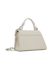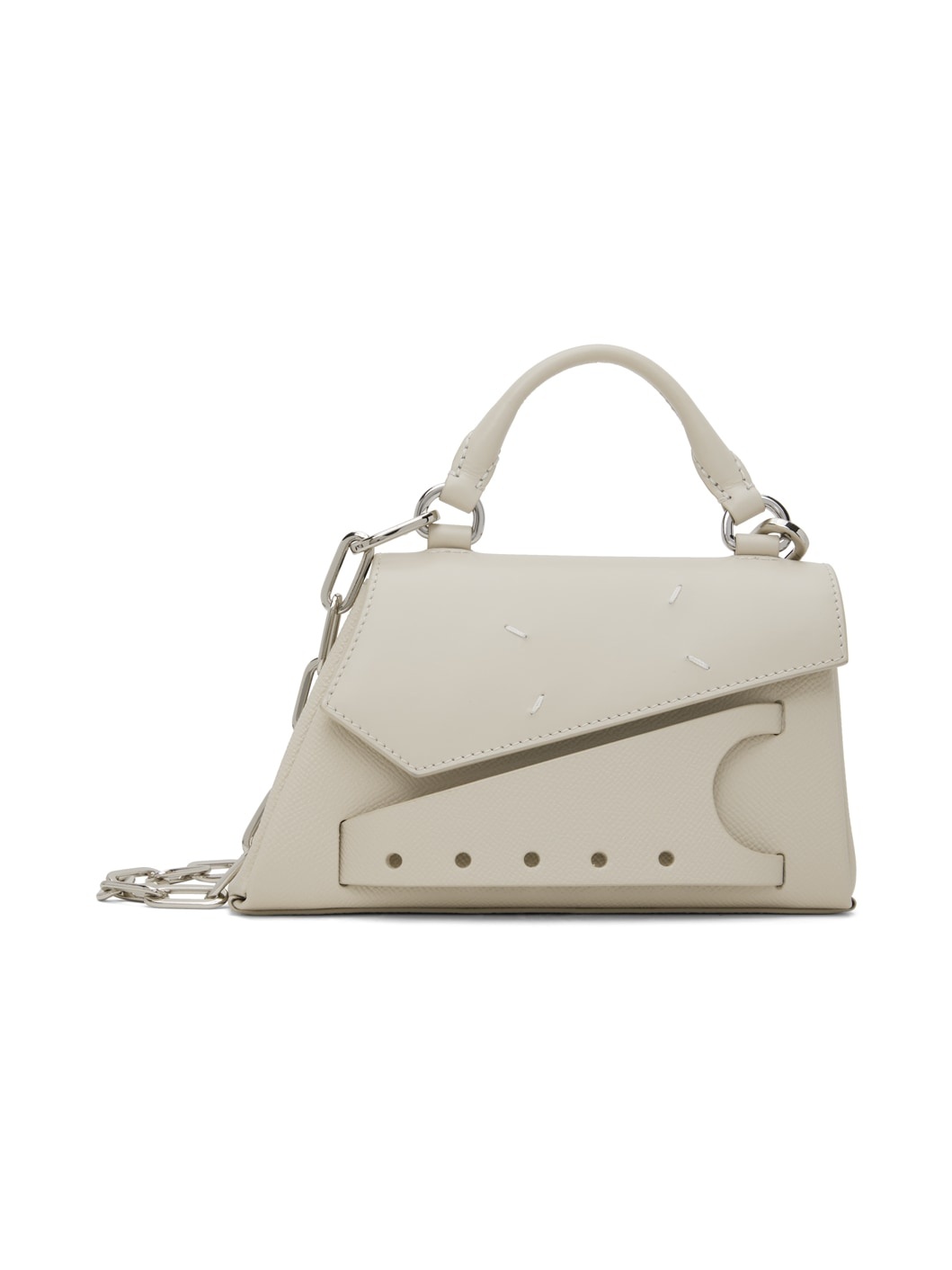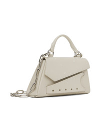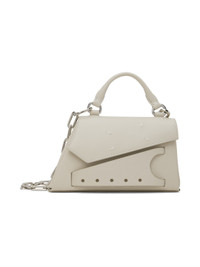 Paneled polished calfskin and grained calfskin messenger bag in beige. · Fixed carry handle at top and face · Adjustable and detachable chain link shoulder strap · Signature white stitching at magnetic flap · Patch pocket at interior · Fleece lining · H5" x W8" x D2.5" Supplier color: Greige