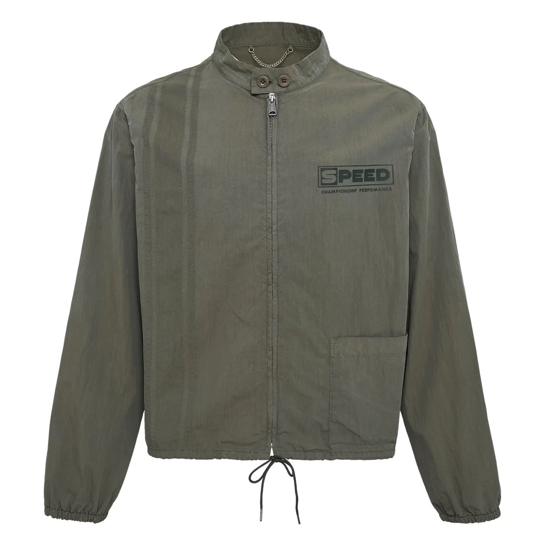 600077727KHA046 / S50AM0651/M35046/694 - Front zip closure with oversized pull tab - Stand collar with decorative chain detail - Two front patch pockets - Elasticated cuffs and adjustable drawstring hem - Speed Championship Performance branding - Relaxed oversized fit - Poly-cotton canvas construction The Maison Margiela Speed Championship Performance Jacket delivers avant-garde utility with racing-inspired design codes. Crafted from lightweight poly-cotton canvas in military olive green, featuring signature collar chain detailing and functional pocket construction. The relaxed fit and drawstring hem create a distinctive silhouette that bridges streetwear and high fashion aesthetics.