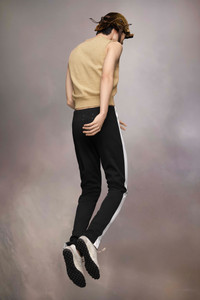 The trousers in cotton jersey feature a tied waist and pin tucks. They have a sportswear-inspired contrast stripe down the side, with zips at the hem to alter the silhouette. Margiela's signature, the four stitches, appear at the back; the opposite of a label. Product Details Item ID S50KA0675S23168900 Primary Fabric: 100% Cotton Pocket Lining: 100% Polyamide-Nylon Cotton sweatpant with side stripe Elasticated regular waist Skinny legs Zipped bottom Four stitches at the back Made in Italy Model is 188 cm tall and wears a size 46.
