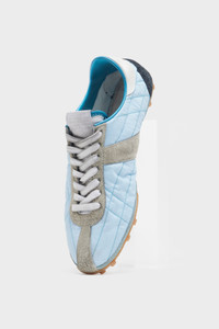 Inspired by 1960s spike shoes, the Sprinters redefine retro athleticism through exaggerated textural contrasts. The uppers, crafted from quilted fabric and hairy suede, are accentuated by a bold contrast heel and precisely stitched panels. A subtle numeric logo appears on the tongue, while the outsole bears the Maison’s footwear code, 22.Maison Margiela's signature white stitch appears at the back; the opposite of a label. Product Details Item ID S57WS0514P7415HB057 Upper: 100% Polyester Contrast: 100% Calf Leather Contrast: 100% Calf Leather Lining: 100% Cotton Contrast: 100% Calf Leather Inside: 100% Calf Leather Sole: 100% Rubber Low-top sneakers with quilted exterior Suede calf leather trims and overlays Gum rubber sole with grip tread Numeric signature label at the tongue White stitching at the back Made in Italy