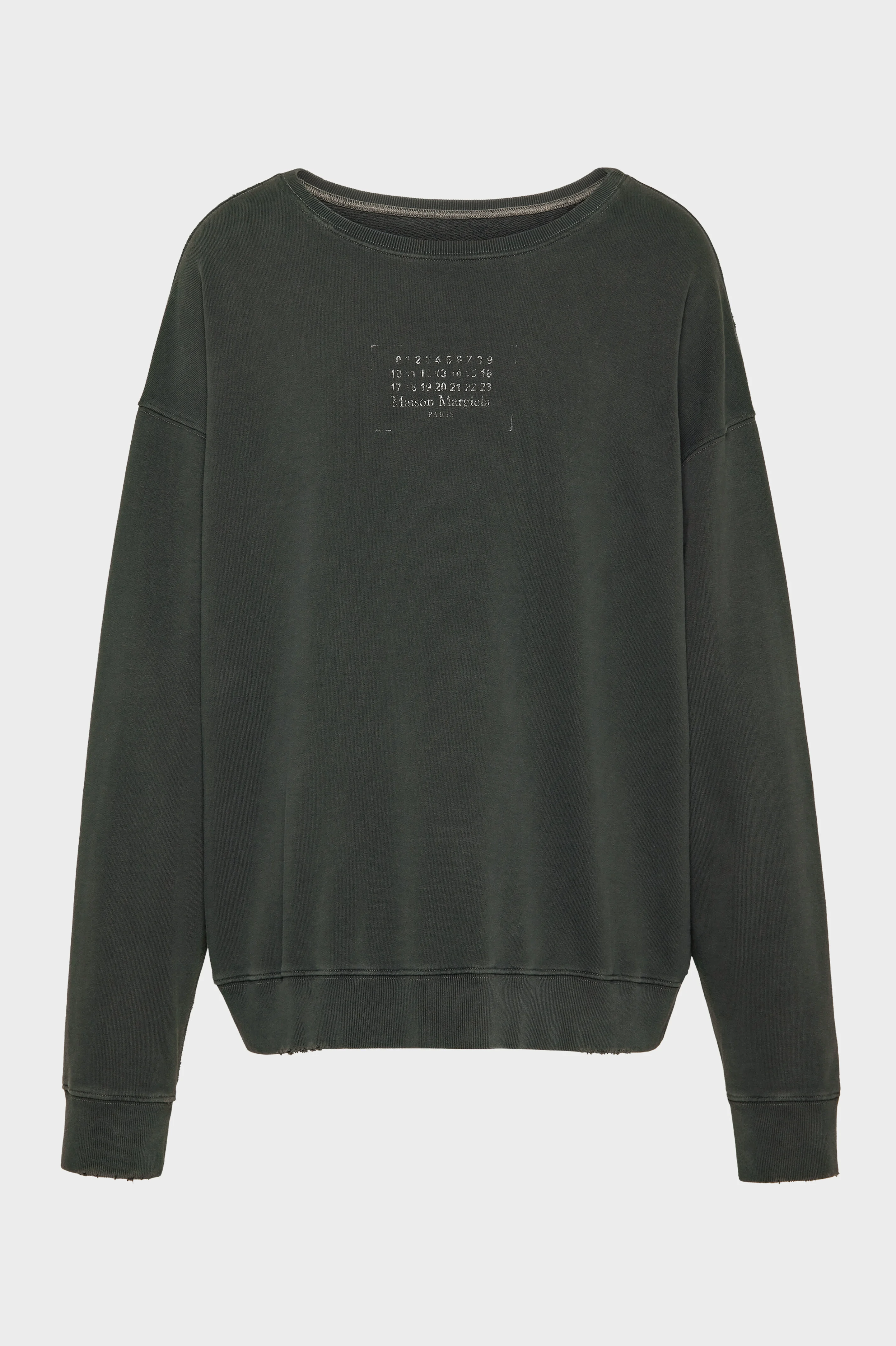 The sweatshirt comes in cotton with dropped shoulder seams and an oversized silhouette for a relaxed take. It has ribbed trims with distressed edges for a worn-in look. Across the chest, the stamped numeric logo appears deliberately faded in parts. Maison Margiela's signature, the four stitches, appear at the back; the opposite of a label. Product Details Item ID S50GU0235M25019969 Primary Fabric: 100% Cotton Cotton sweatshirt Crewneck Dropped shoulder Maison Margiela logo stamp at the front Ribbed trimsFour stitches at the back Made in Italy Model is 188 cm tall and wears a size S.
