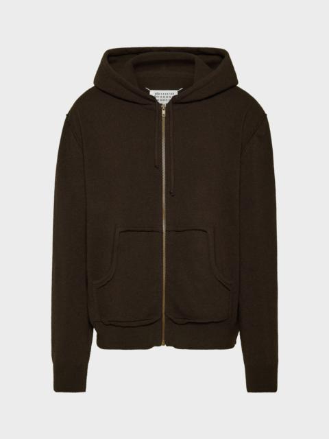 Crafted from a soft cashmere wool bend, the loungewear zip-through hoodie features a Decortique front pocket, adding texture and volume to the front of the sweater. It is designed with dropped shoulder seams for a relaxed take, ribbed trims and a drawstring at the neck. Maison Margiela's signature, the four stitches, appear at the back; the opposite of a label. Product Details Item ID S50GU0234M13095144M Primary Fabric: 70% Wool 30% Cashmere Midweight wool cashmere blend crewneck Gauge 12 Zip closure Adjustable drawstring hood Decortique kangaroo pocket with visible seams Ribbed trims Four stitches at the back Model is 185 cm tall and wears a size S.