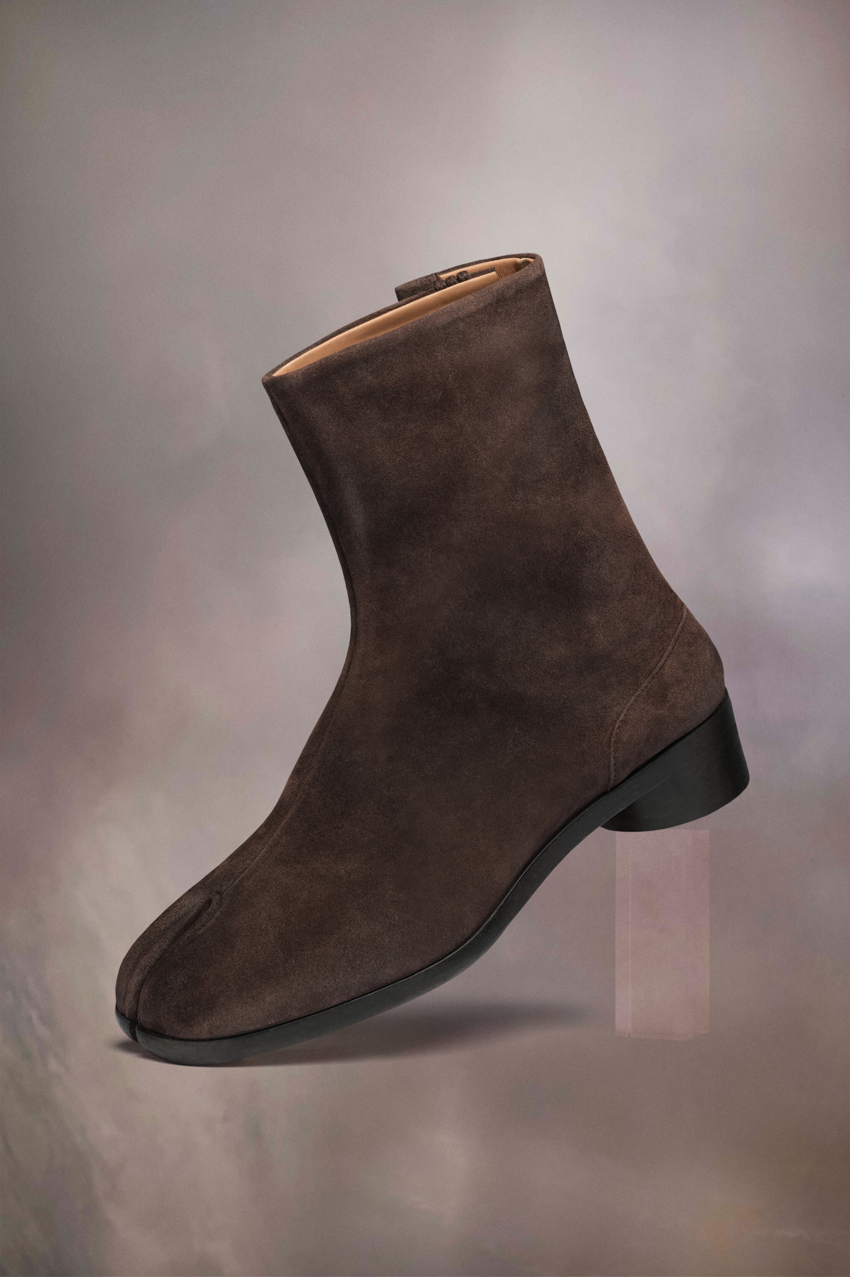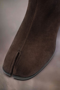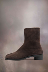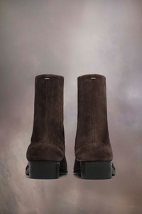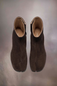 Crafted from suede with a used treatment created by hand, the ankle boots have a 3cm cylindrical heel. The back features a single white stitch showing the hand of Maison Margiela. They feature the Tabi split-toe shape, inspired by the traditional 15th century Japanese sock bearing the same name – launched for the Maison's debut collection in 1989. It captures the avant-garde and insubordinate spirit of the Maison and exists as a heritage classic, continually explored through each collection. Product Details Item ID S57WU0153P4350T2154 Upper: 100% calf leather Lining: 100% lamb leather Inside: 100% lamb leather Sole: 100% calf leather Contrast: 100% rubber Heel height: 3 cm/1,2 in Cylindrical heel Ankle boots in suede calf leather with aged treatment Tabi split toe White stitching at the back Hook closure Gently brush with a delicate brush to clean Made in Italy A digital certificate provided by the Aura Blockchain Consortium guarantees the authenticity of this product. Discover more on auraluxuryblockchain.com/#about