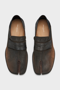 The Tabi City loafer is crafted in suede with a foil treatment, shaped with a collapsible heel that transforms it into a babouche silhouette. It features the Tabi split-toe, inspired by the traditional 15th-century Japanese sock bearing the same name – launched for the Maison's debut collection in 1989. A heritage icon continually reinterpreted, it captures the avant-garde spirit of the Maison. Maison Margiela's signature stitch appears at the back; the opposite of a label. Product Details Item ID S57WR0117P7549H8322 Upper: 100% calf leather Contrast: 100% calf leather Lining: 100% ovine leather Inside: 100% ovine leather Sole: 100% calf leather Contrast: 100% rubber Heel height: 2.1 cm to 2.8 cm Suede with foil treatment Tabi split toe Four stitches at the back Made in Italy