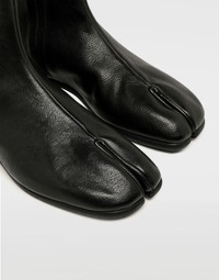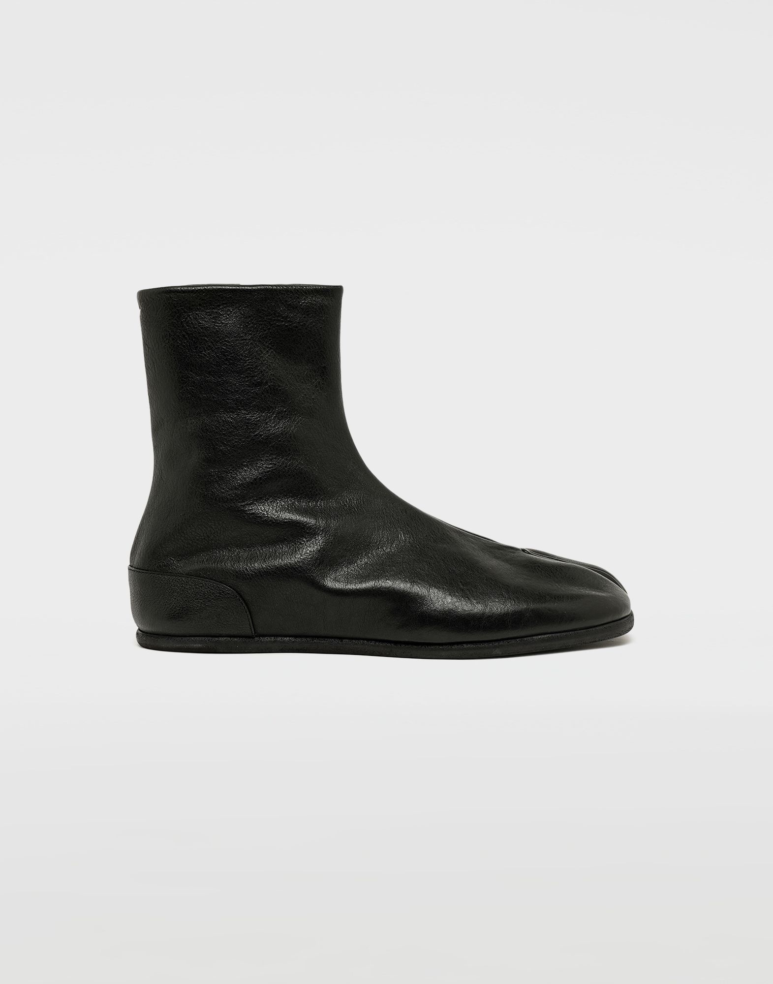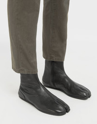 The iconic Maison Margiela 'Tabi' boot adapted for the menswear collection. These boots are crafted from vegetable goat leather in black, featuring the classic split 'Tabi' toe and flat soles. Item details 100% Bovine leather Basic solid colour Leather sole Inner zip closure Textured leather