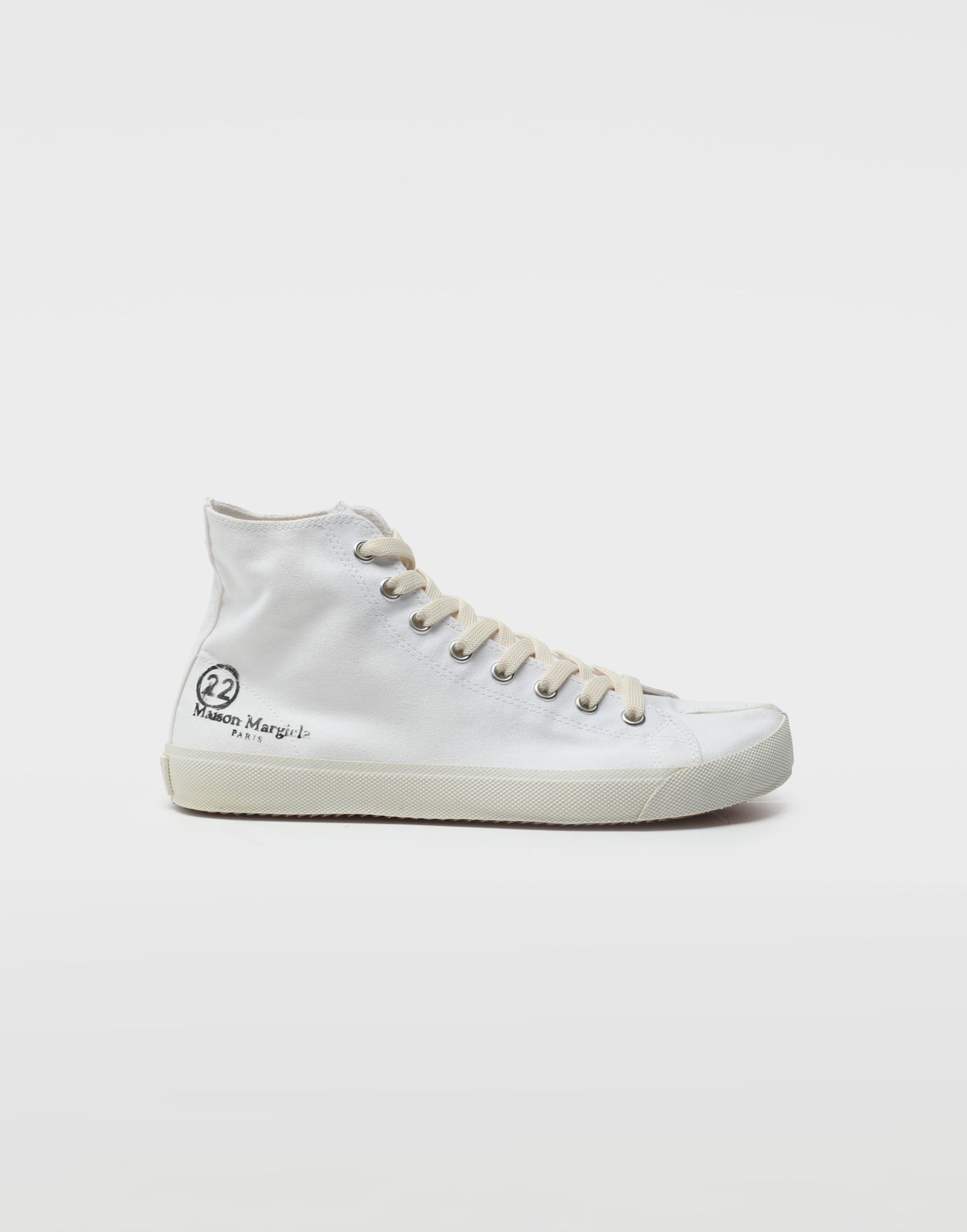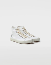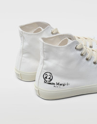 These high-top sneakers are crafted from pure cotton with rubber soles, featuring the Maison's iconic Tabi cleft toe and the iconic Line 22 printed logo on the outer side. The back is finished with the Maison's white tab logo and the iconic straight white stitch. Item details 100% Cotton Logo Canvas Solid colour Laces Rubber sole