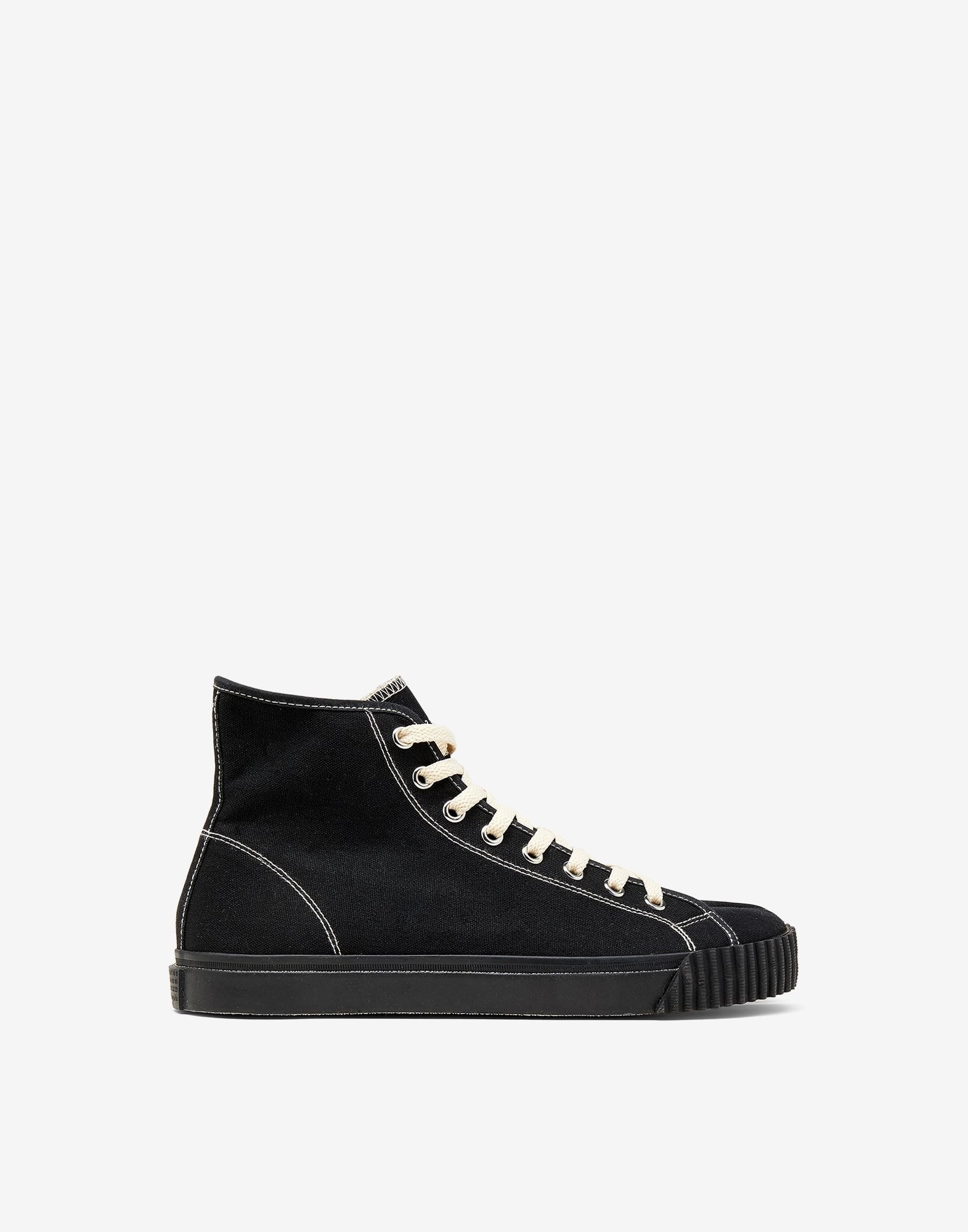 High-top sneakers in canvas with the Maison's iconic Line 22 logo, classic rubber sole and the Tabi split-toe, inspired by the traditional 15th century Japanese sock bearing the same name – launched for the Maison's debut collection in 1989. It captures the avant-garde and insubordinate spirit of the Maison and exists as a heritage classic, continually explored through each collection. Made in Italy. Item details 100% Cotton Canvas Logo Laces Square toeline Leather lining Rubber sole