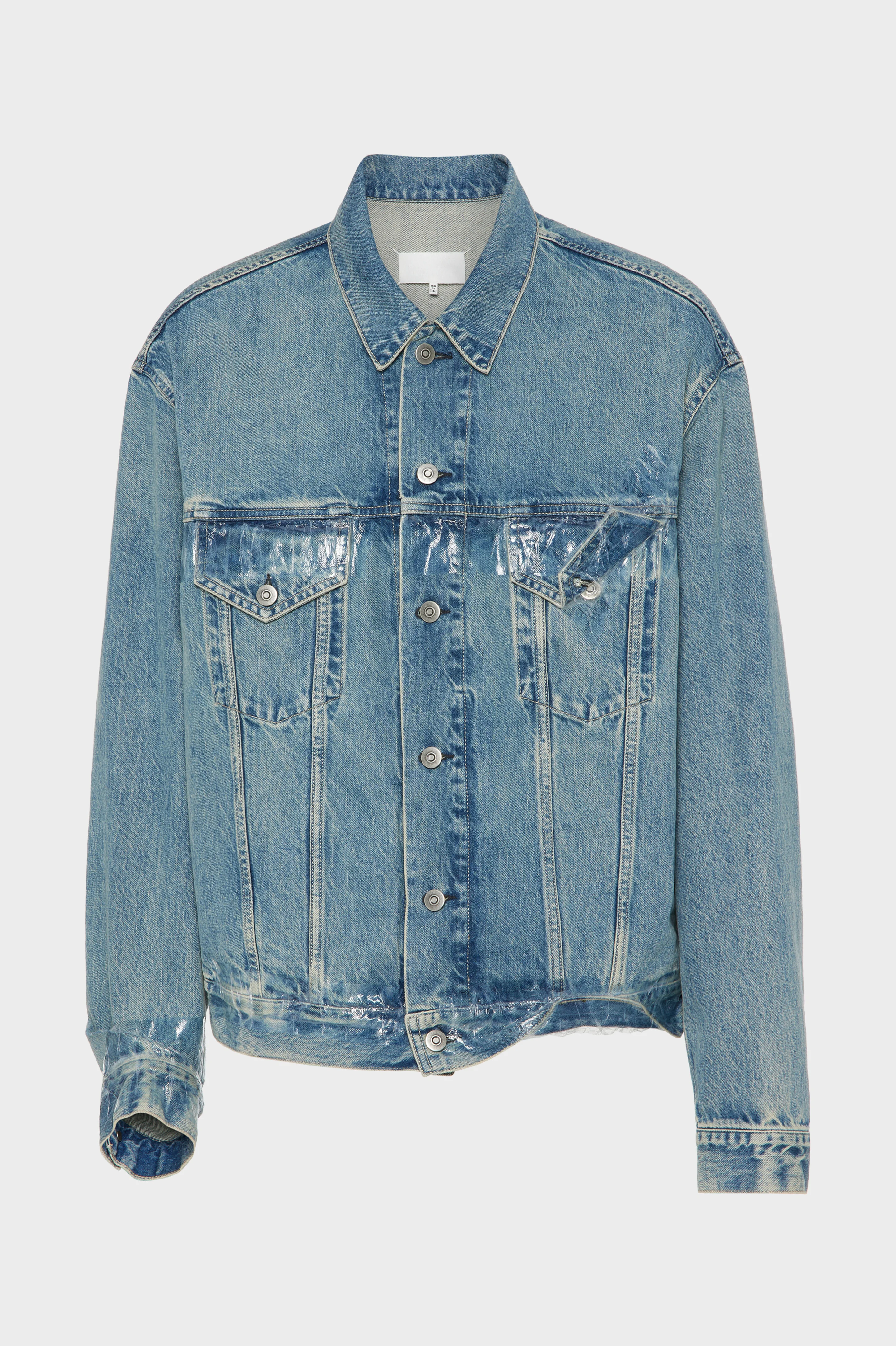This denim jacket revisits a classic silhouette through the application of transparent tape detailing across the chest, hem, and cuffs. The tape partially wraps the garment’s surface, subtly distorting familiar pocket lines and seams while leaving the original structure intact. At the back, the Maison’s signature four stitches appear; the opposite of a label. Product Details Item ID S67AM0109M30066962 Primary fabric: 100% cotton Handpainted effect on chest and lower front Long sleeves Shirt collar neckline Front button closure Four stitches at the back Made in Italy