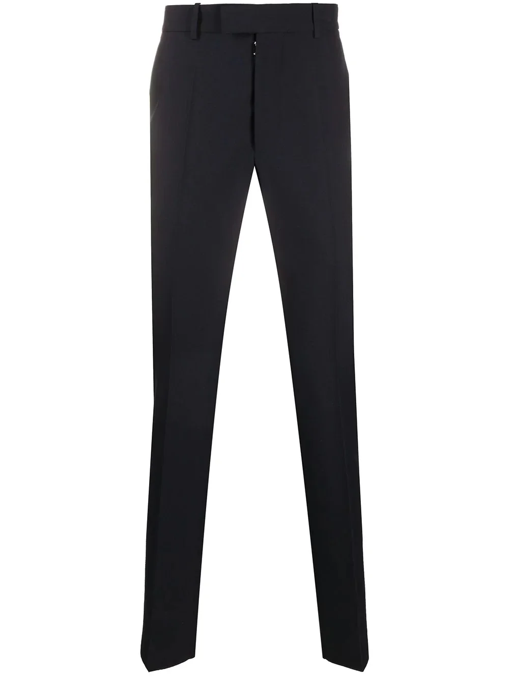 tapered leg tailored trousers We remember an old friend once telling us; "A pair of tailored trousers will get you far in life." And by gosh he was right, especially when said trousers are these navy blue tailored ones from Maison Margiela. Get ready for the big time. Made in Italy Composition Lining: Cotton 100%, Viscose 100% Outer: Polyester 55%, Wool 45% SIZE & FIT Model measurements Height 6 ft 2 in(1.87 m) Bust/Chest 36.41 in(92.5 cm) Hips 37 in(94 cm) Waist 29.52 in(75 cm) FittingInformation This piece fits true to size. We recommend you get your regular size Cut for a slim fit Made with a mid-weight non-stretch fabric Washing instructions Dry Clean Only