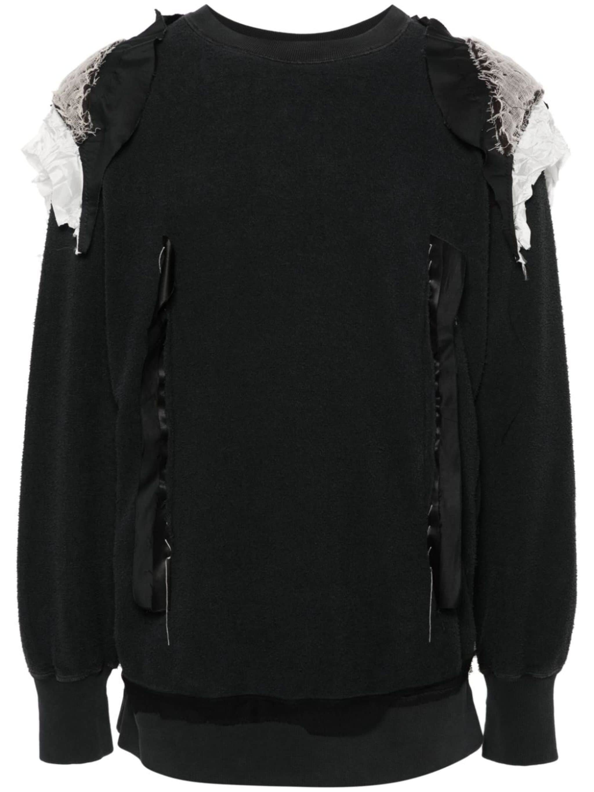 black cotton terry-cloth effect distressed effect ribbed crew neck patchwork detailing long sleeves two side inset pockets ribbed cuffs and hem jersey lining pull-on style Size & Fit Model Measurements: Height: 1.86 m Bust/Chest: 86.0 cm Hips: 96.0 cm Waist: 80.0 cm Model wears size L Fabric and Care Designer Style ID: S67GU0032S25570 Designer Colour: 961 BLACK Composition: Outer: Cotton 100%; Lining: Cotton 45%, Viscose 55% Washing instructions: Dry Clean Only Made in Italy
