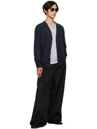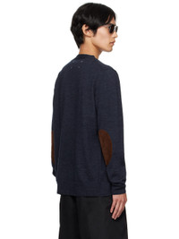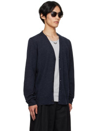 Knit wool cardigan. · Rib-knit Y-neck, hem, and cuffs · Button closure · Suede elbow patches · White stitching at back collar Supplier color: Navy 100% wool. Made in Romania 252168M200006