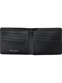 Pebble-grained calfskin bifold wallet. · Signature white stitching at back face · Eight card slots and two patch pockets at interior · Two note slots · Moire lining · H3.75" x W4.5" x D1" Supplier color: Black Calfskin. Made in Italy 252168M164015