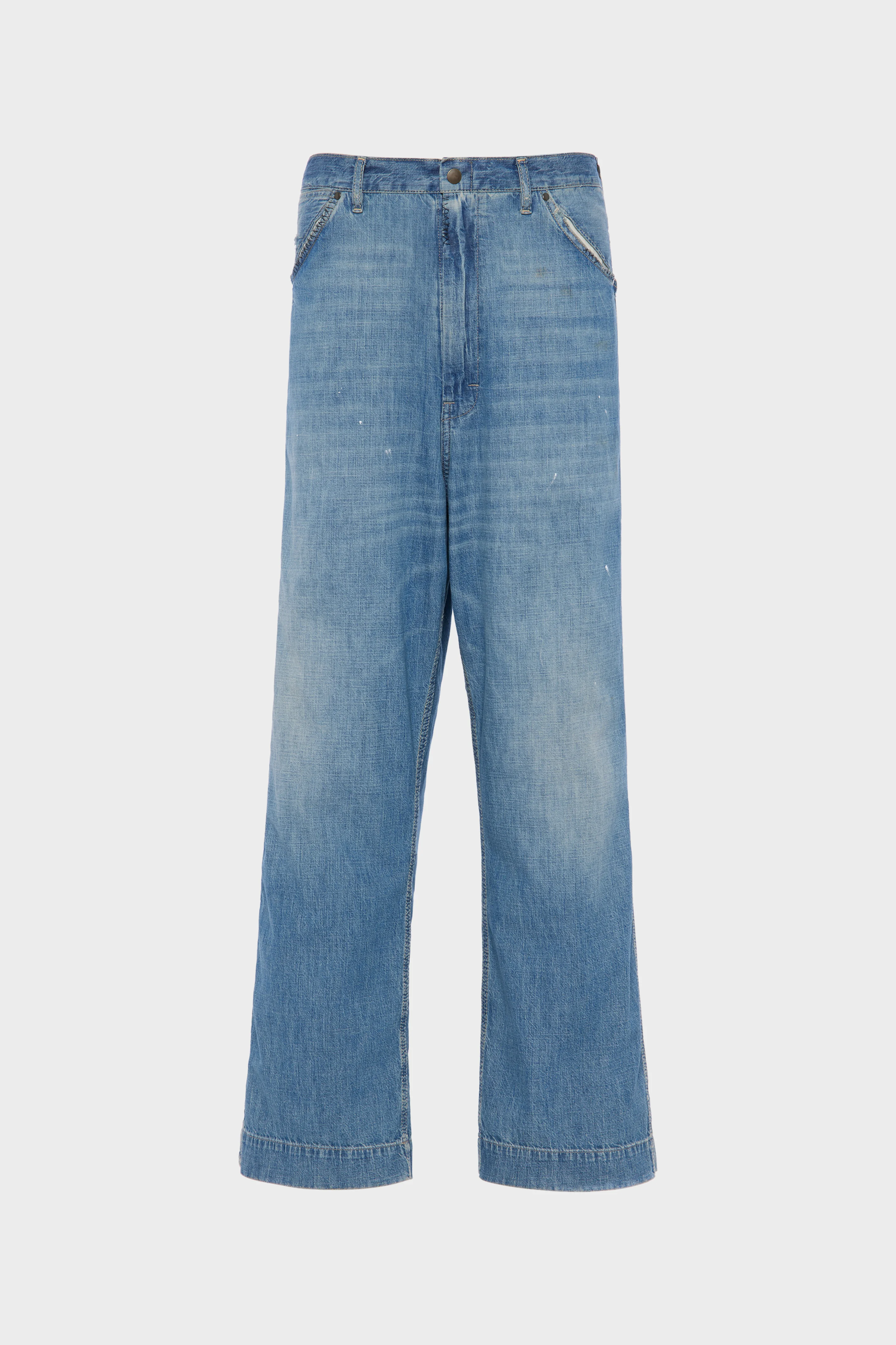 Wide-leg denim jeans, distressed with subtle paint splatters and softened by a vintage classic wash. Oversized patch pockets with irregular stitching reinforce the relaxed cut, while the memory of the jacron patch exposes reverse fabric. At the back, the Maison’s signature four stitches appear; the opposite of a label. Product Details Item ID S50KA0711M30021963 Primary fabric: 100% cotton Pocket lining: 65% polyester 35% cotton 8 oz. japanese denim Full-length wide-leg fit Distressed effect at pockets and hems Zip and button front closure Four stitches at the back Made in Italy