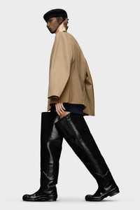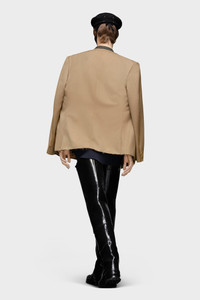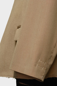 A blazer in wool with a mandarin collar and asymmetric pockets. It features a contrast collar, the memory of cuffs and four white stitches at the back showing the hand of the Maison: the opposite of a label. Product Details Item ID SI1BN0001S54330740M Outer: 100% Wool Lining: 65% Acetate, 35% Viscose-Rayon Pocket lining: 100% Cotton Collarless jacket Y-neckline Concealed front button fastening Front flap pockets Basting stitch on cuffs and shoulders Raw hem Four stitches at the back Made in Italy The model is 6'2" tall and wears size 46.