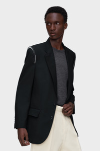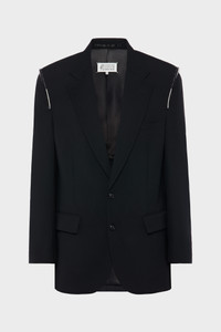This single-breasted jacket in virgin wool reinterprets formal tailoring through the Maison's anonymity of the lining concept. Its structured silhouette is interrupted at the shoulders, where raw elements reveal the garment’s inner architecture. A subversive reworking of sartorial codes, it closes with a single button fastening. At the back, the Maison’s signature four stitches appear; the opposite of a label. Product Details Item ID S50BN0549M35745900 Primary fabric: 100% virgin wool Gauge: tropical wool Lining: 63% acetate 37% viscose-rayon Pocket lining: 100% cotton Raw edge effect on shoulder seams Long sleeves Shirt collar Front button closure Four stitches at the back Made in Italy