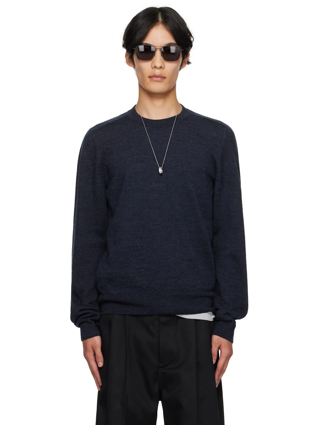Knit wool sweater. · Rib-knit crewneck, hem, and cuffs · Suede elbow patches · White stitching at back collar Supplier color: Navy 100% wool. Made in Romania 252168M201005