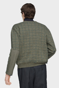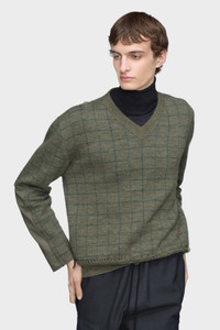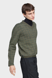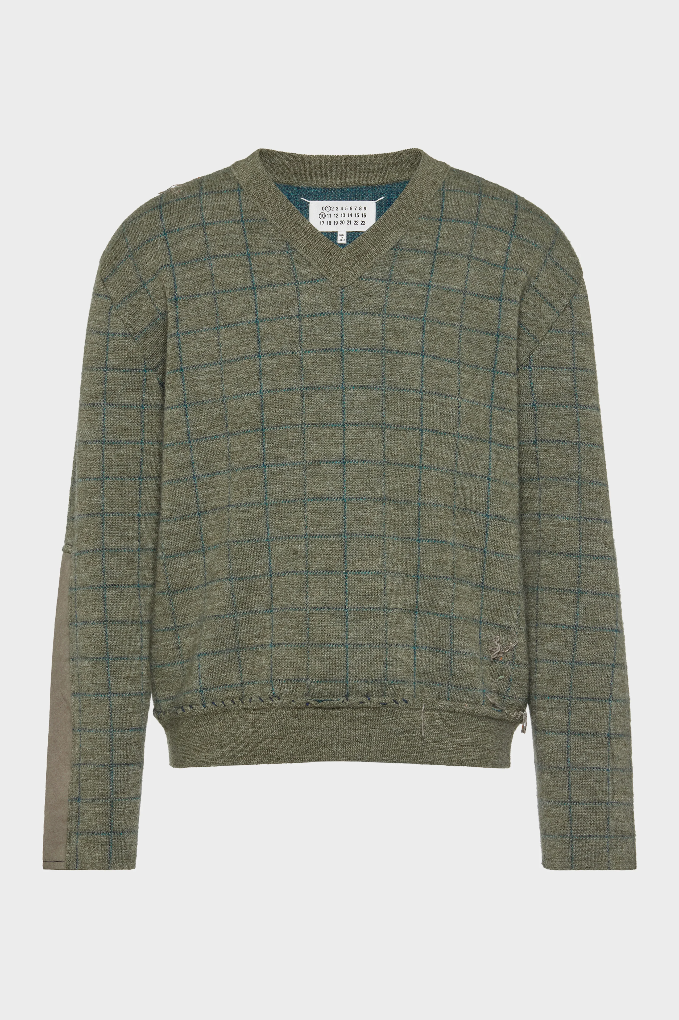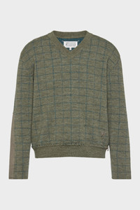 In a textured check design, this V-neck sweater reflects the collection’s reinterpretation of countryside archetypes. Knitted in Charles patching – a technique inspired by King Charles mending his own clothing – it features visible repair stitching and irregular finishing at the hem, a garment shaped by time and use. Maison Margiela’s signature, the four stitches, appear at the back; the opposite of a label. Product Details Item ID S50HN0016M13146613J Primary Fabric: 100% Virgin Wool V-neck sweater in checked virgin wool Contrast panel at the sleeve Distressed hem Ribbed collar, cuffs, and hem Four stitches at the back Made in Italy