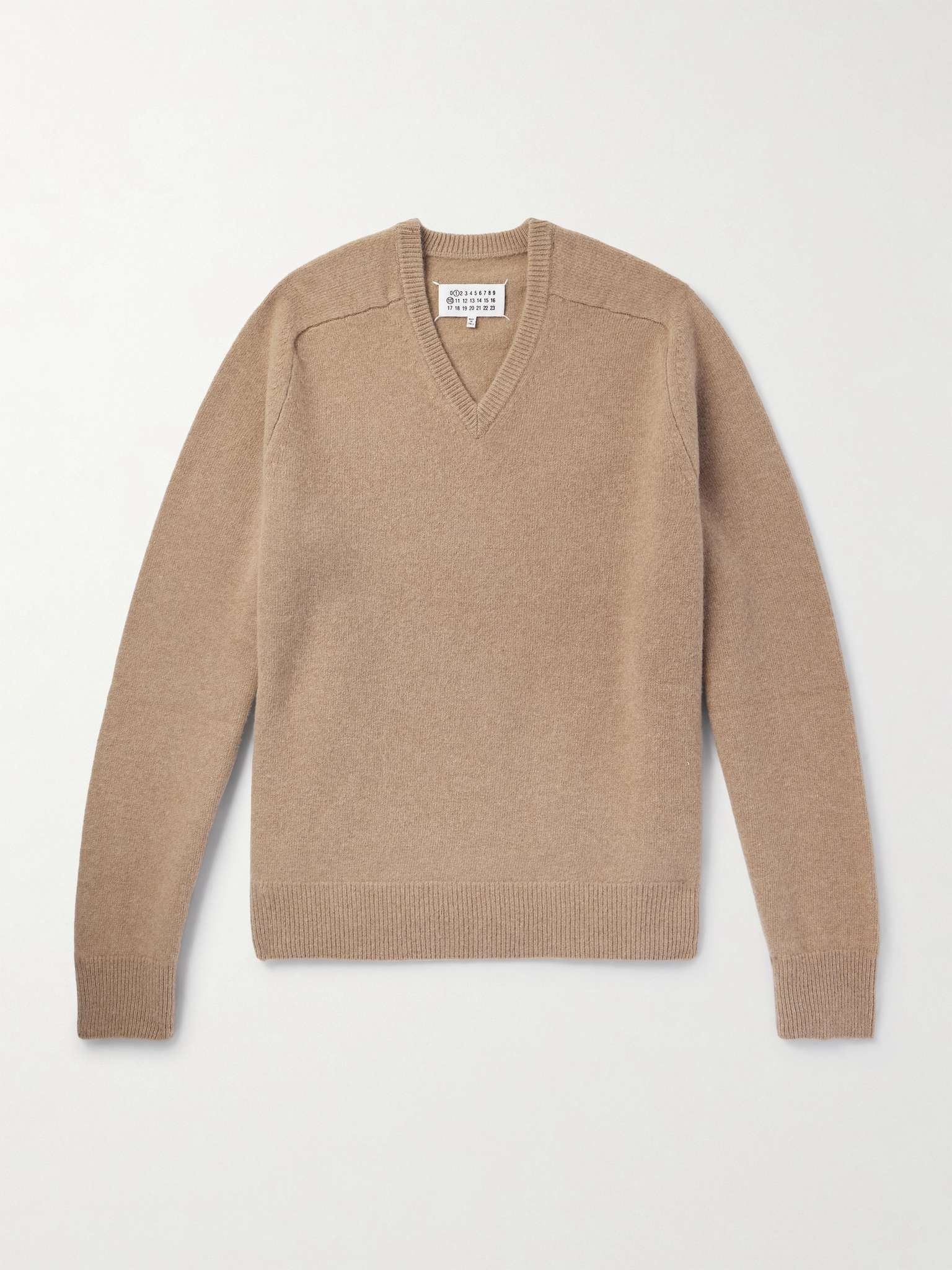 Maison Margiela's V-neck sweater has a classic, minimalist design that makes it versatile and easy to style. Knitted with comfortable raglan sleeves, it’s been crafted in Italy from washed seven-gauge wool and meant to fit slightly loose. Size & Fit - Fits true to size. Take your normal size - Designed for a slightly loose fit - Mid-weight knit - Model is shown wearing a M - Model measures: chest 38"/ 96cm, height 6'0"/ 183cm Details & Care - Beige mélange wool - 100% wool - Dry clean