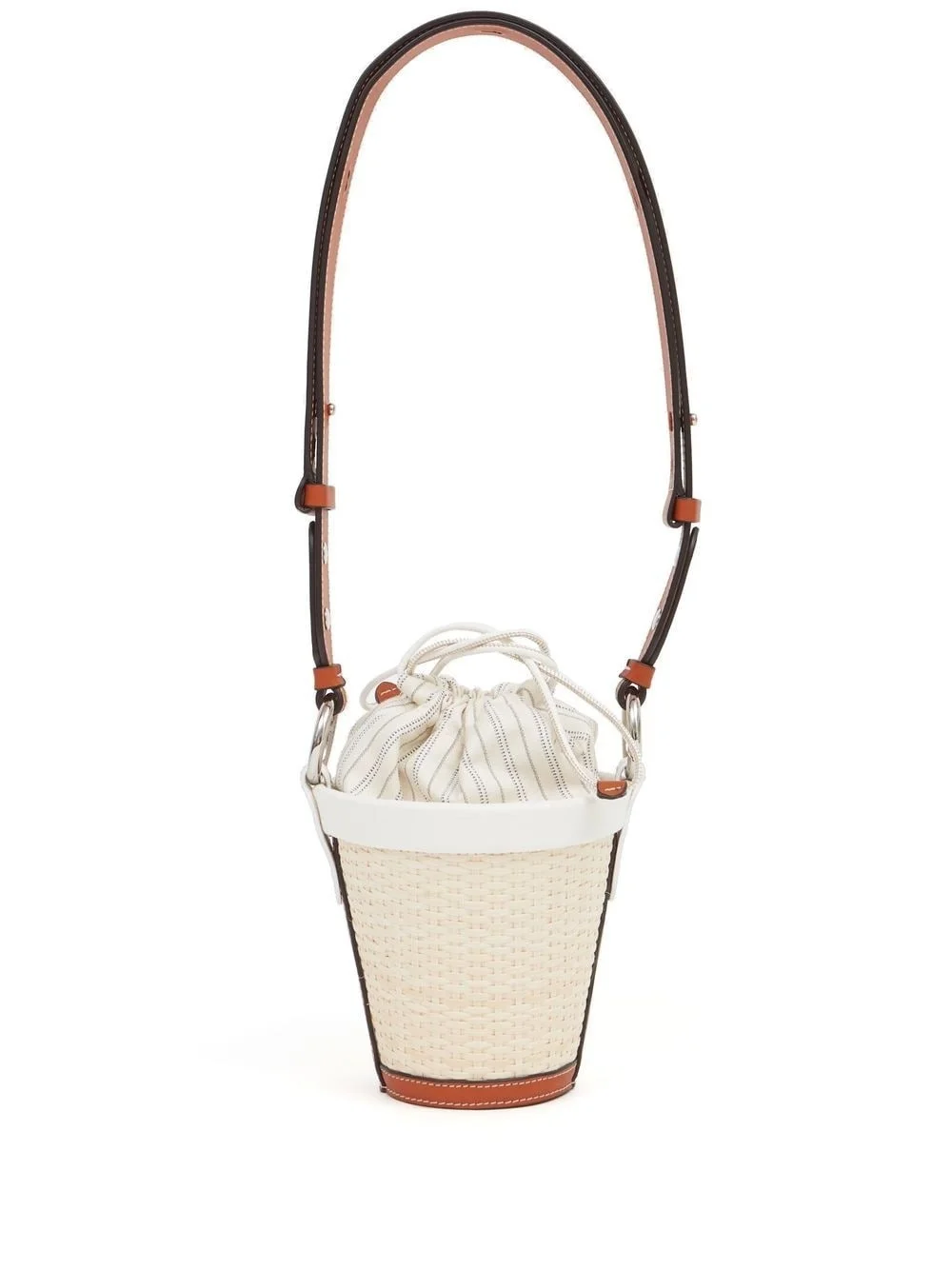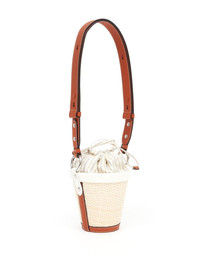 Fire woven bucket bag Highlights - Cream white/brown - Raffia/calf leather/cotton - Woven raffia design - Drawstring fastening - Adjustable shoulder strap - Full lining Made in Italy Composition Outer: Raffia 100% Lining: Polyester 100%, Cotton 100% Trims: Calf Leather 100% SIZE & FIT Measurement DEPTH 3.5 in(8.8 cm) WIDTH 7.1 in(18 cm) HEIGHT 9.1 in(23.1 cm)