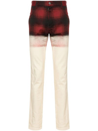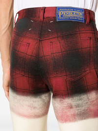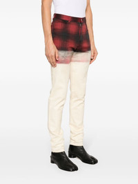 x Pendleton checked skinny jeans Maison Margiela says its collaboration with Pendleton ‘fuses the plaids of the American heritage weaver with the haute couture grammar of Creative Director John Galliano.’ Hailing from the collection, these skinny jeans are printed with red and black checks at the waist that fade into the cream leg, creating the illusion of two fabrics melded together. Highlights - Cream white/black/red - Stretch-cotton - Denim - Check pattern - Ombre print - Mid-rise - Belt loops - Classic five pockets - Signature four-stitch logo - Logo patch to the rear - Skinny cut - Concealed front button, hook and zip fastening Made in Italy Composition Lining: Cotton 100% Outer: Cotton 97%, Elastane 3% SIZE & FIT Model measurements Height 6 ft 2 in(1.89 m) Bust/Chest 37.79 in(96 cm) Hips 37 in(94 cm) Waist 29.92 in(76 cm) FittingInformation Designed for a skinny fit, these jeans offer a close fit throughout Constructed from stretch denim, this piece offers a stretch fit with durability This piece fits true to size – take your usual size Washing instructions Machine Wash