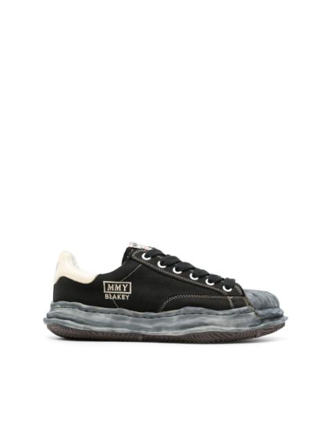 Blakey canvas sneakers Set atop the label's signature warped rubber outsole, this iteration of Maison Mihara Yasuhiro's Blakey sneakers arrive in a neutral hue. Their low-top canvas silhouette is decorated with branding on the heel counter, sides and tongue. Highlights - Light beige - Canvas - Branded heel counter - Branded footbed - Logo print to the side - Logo patch at the tongue - Front lace-up fastening - Round toe - Chunky rubber sole Imported Composition Calf Leather 100% Outer: Cotton 100%, Rubber 100% Sole: Rubber 100% Lining: Fabric 100% SIZE & FIT Measurement HEEL 1.57 in(4 cm) Sole height 1.18 in(3 cm)