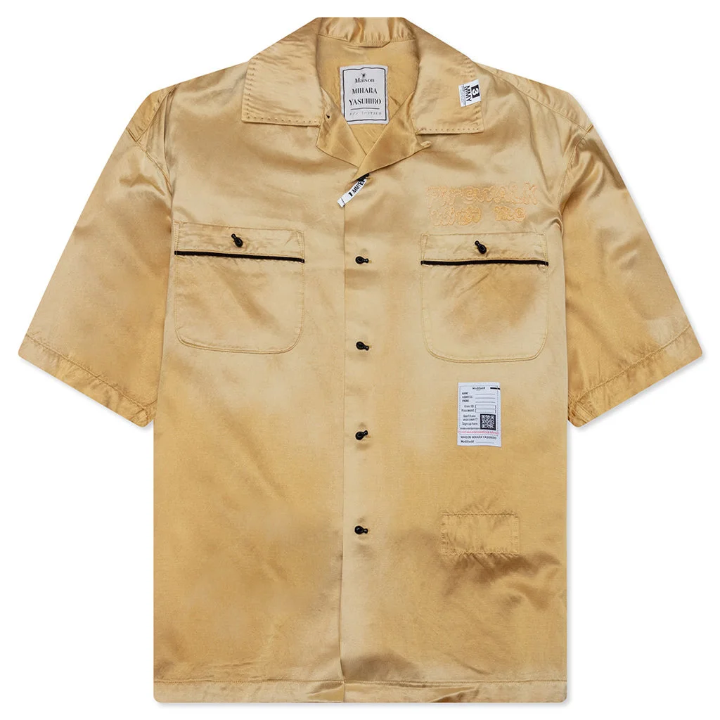 The Bowling S/S Shirt from Maison Mihara Yasuhiro is crafted from a soft blend of cotton and rayon. The satin bowling shirt features classic details like a cuban collar, button-up closure, and dual chest pockets. Tonal chain-stitch embroidery sits at the chest and back, while woven brand tags add a signature touch. - 58% Cotton, 42% Rayon - Satin fabric - Cuban collar - Button-up front - Bowling pin-shaped buttons - Tonal chain-stitch embroidery - Chest pockets - Woven brand tags - Style No: J14SH186-YEL
