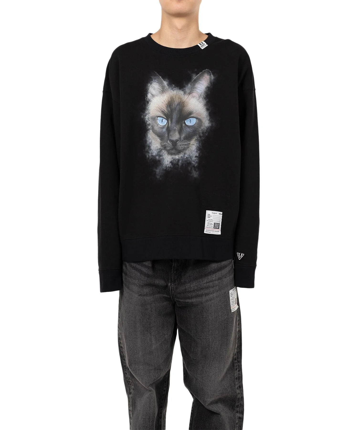 【2025 Autumn/Winter Collection】 Cat Printed Sweatshirt Sweatshirt with Cat printed on the front. Collection theme “A Little Paradox Part Six” printed on back. Crew neck. Original embroidered patch on left cuff. *The cat species printed on the product differs depending on the color of the product. Wearing model : 182cm Wearing size : 48 ※Product images may appear different from the actual item due to lighting conditions during photography or variations in monitor settings. ※Some photos feature sample items; actual products may differ slightly in finish or sizing. ※Color, texture, and specifications may vary slightly due to differences in production timing or individual characteristics of each piece. We appreciate your understanding. - Item No: J15PO742 - Brand: Maison MIHARA YASUHIRO - Category: MENS » TOPS » SWEATSHIRTS - Season: 2025 A/W - Material: COTTON 100% - Made In: JAPAN