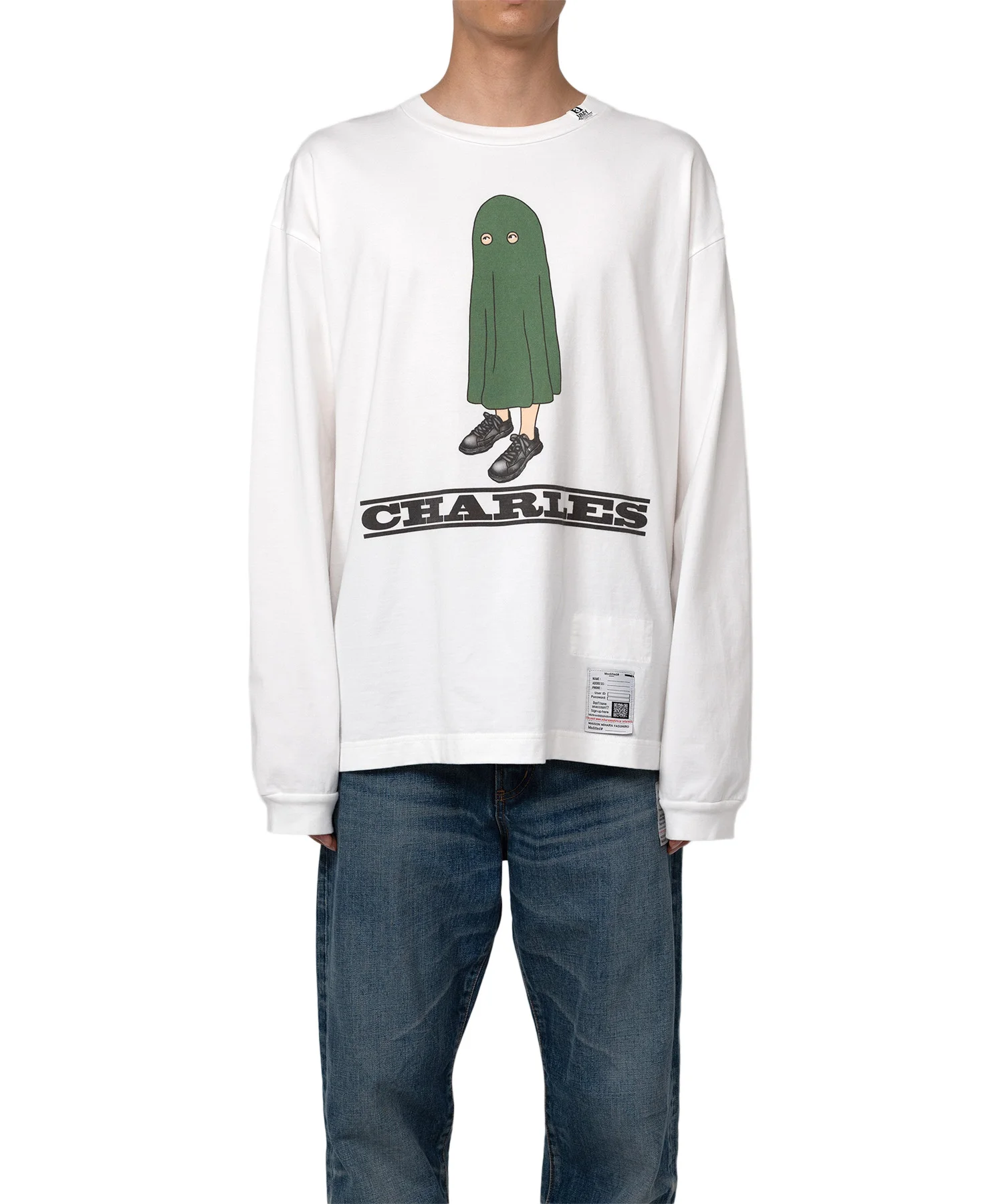 【 2024 Spring/Summer Collection 】 CHARLES Printed Long Sleeve T-shirt Long sleeve t-shirt with BILLY printed. Billy is wearing the Charles model of the original sole sneakers, and the word "CHARLES" is printed on the front. The shy Billy realized he had no clothes when he went outside, so he is wearing a sheet over his head. Wearing model : 182cm Wearing size:46 - Item No: A12LT682 - Brand: Maison MIHARA YASUHIRO - Category: MENS » TOPS » TSHIRTS - Season: 2024 S/S - Material: COTTON100% - Made In: JAPAN