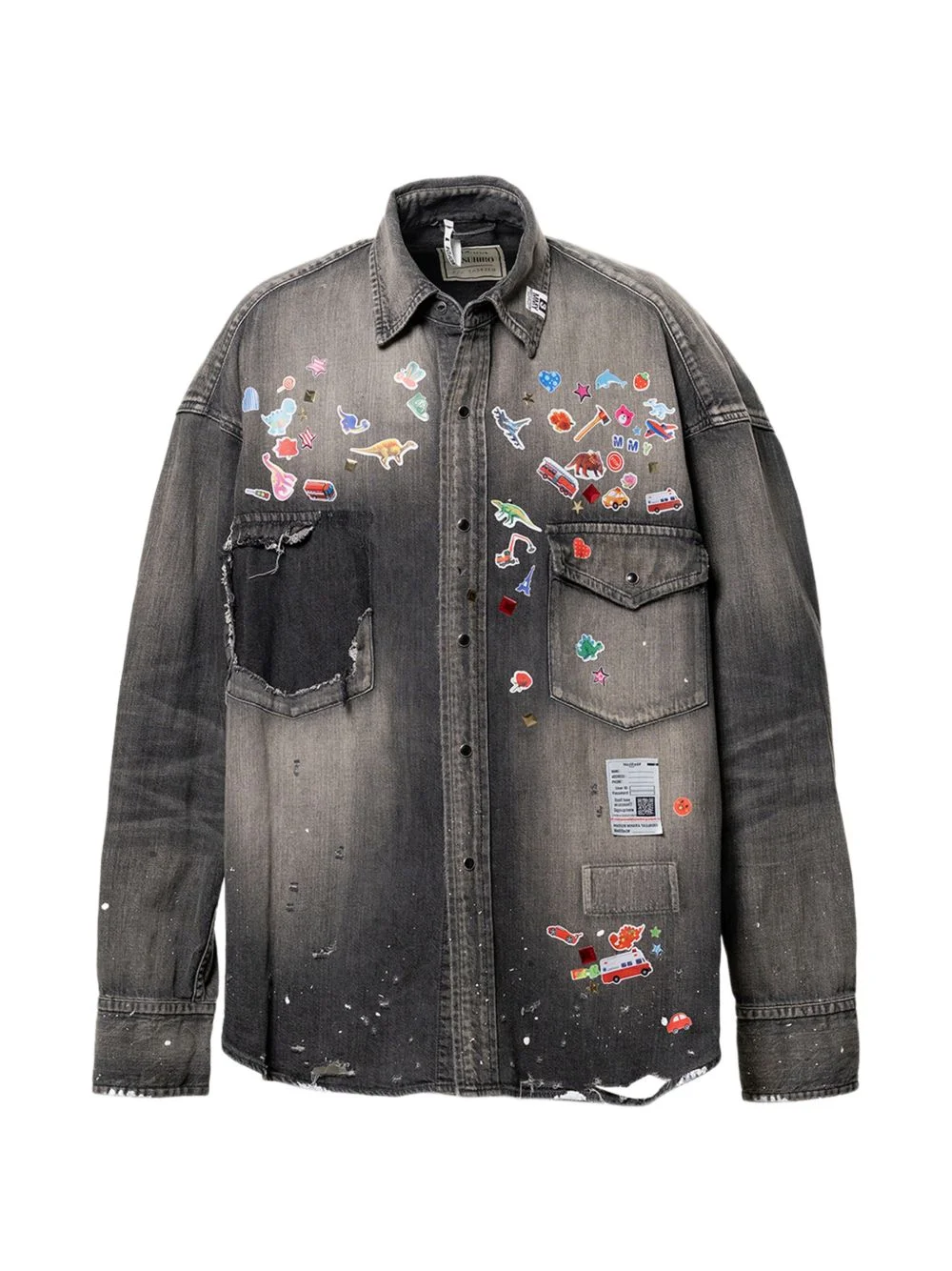 sticker-print denim shirt Highlights - Black - Sticker print - Front button fastening - Chest pockets - Raw-cut finish - Long sleeves - Buttoned cuffs Imported Composition Body: Cotton 100% Washing instructions Do Not Wash/Do Not Dry Clean