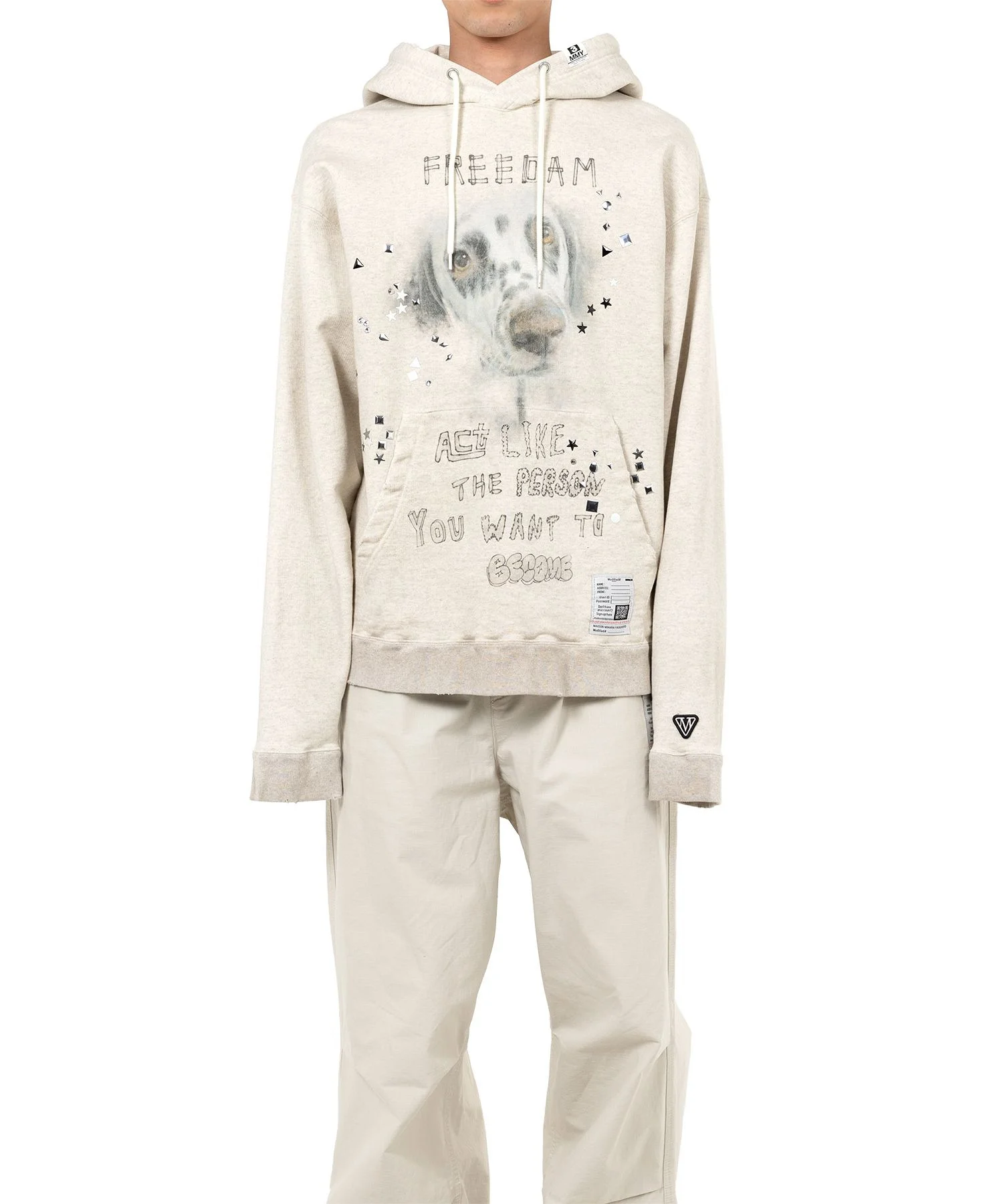 【2025 Autumn/Winter Collection】 Dog Printed Embellished Distressed Hoodie Sweatshirt hoodie with dog printed on the front. Damaged and decorated with rhinestones. Original embroidered patch on the left cuff. Front pocket. *Different breeds of dogs are printed depending on the color of the product. Wearing model : 182cm Wearing size : 48 ※Product images may appear different from the actual item due to lighting conditions during photography or variations in monitor settings. ※Some photos feature sample items; actual products may differ slightly in finish or sizing. ※Color, texture, and specifications may vary slightly due to differences in production timing or individual characteristics of each piece. We appreciate your understanding. - Item No: J15HD722 - Brand: Maison MIHARA YASUHIRO - Category: MENS » TOPS » SWEATSHIRTS - Season: 2025 A/W - Material: COTTON 100% - Made In: JAPAN