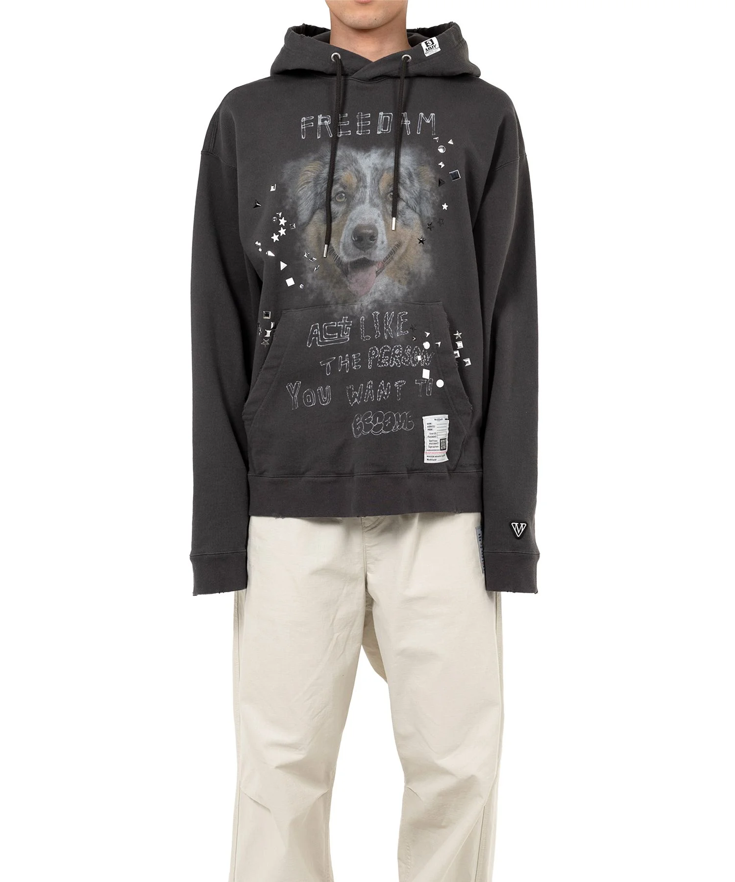 【2025 Autumn/Winter Collection】 Dog Printed Embellished Distressed Hoodie Sweatshirt hoodie with dog printed on the front. Damaged and decorated with rhinestones. Original embroidered patch on the left cuff. Front pocket. *Different breeds of dogs are printed depending on the color of the product. Wearing model : 182cm Wearing size : 48 ※Product images may appear different from the actual item due to lighting conditions during photography or variations in monitor settings. ※Some photos feature sample items; actual products may differ slightly in finish or sizing. ※Color, texture, and specifications may vary slightly due to differences in production timing or individual characteristics of each piece. We appreciate your understanding. - Item No: J15HD722 - Brand: Maison MIHARA YASUHIRO - Category: MENS » TOPS » SWEATSHIRTS - Season: 2025 A/W - Material: COTTON 100% - Made In: JAPAN