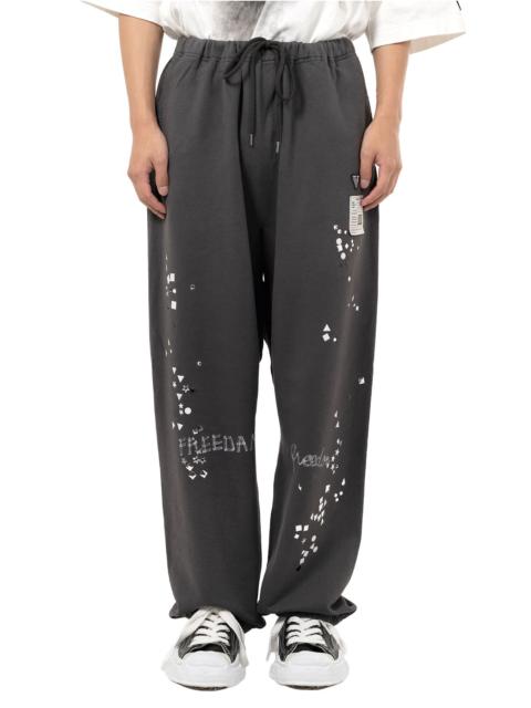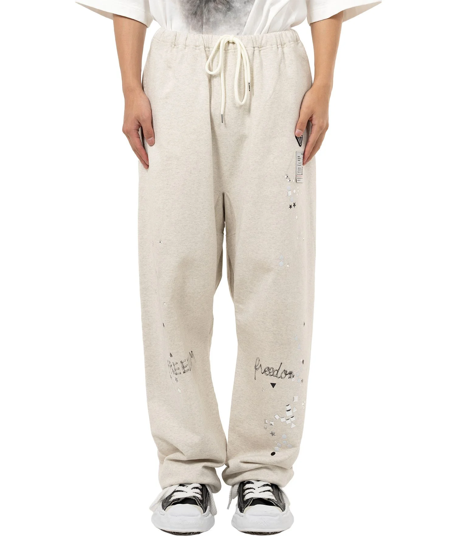 【2025 Autumn/Winter Collection】 Embellished Distressed Sweat Pants Sweatpants with graffiti print on the front. Damaged, rhinestone embellished design. Side and back pockets. Elasticized waistband with drawstring. *Holes and fading throughout are part of the design. Wearing model : 182cm Wearing size : 48 ※Product images may appear different from the actual item due to lighting conditions during photography or variations in monitor settings. ※Some photos feature sample items; actual products may differ slightly in finish or sizing. ※Color, texture, and specifications may vary slightly due to differences in production timing or individual characteristics of each piece. We appreciate your understanding. ※Intentional distressing such as holes, fading, and staining is part of the design and reflects the character of the item. Please enjoy these features as part of its unique aesthetic. - Item No: J15PT724 - Brand: Maison MIHARA YASUHIRO - Category: MENS » BOTTOM » PANTS - Season: 2025 A/W - Material: COTTON 100% - Made In: JAPAN