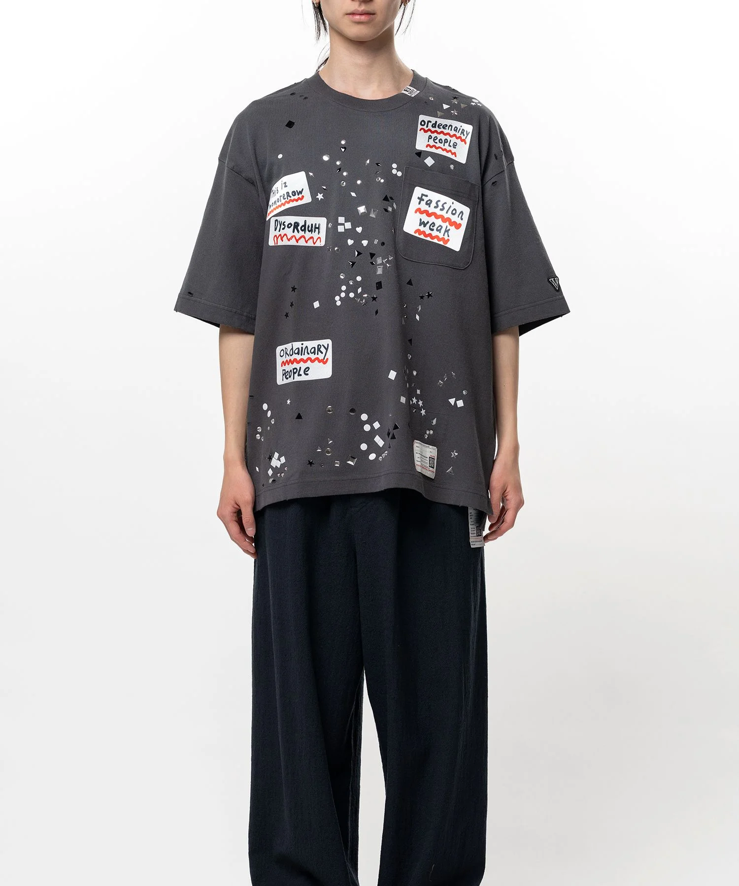 【2026 Spring /Summer Collection】 Embellished Sticker T-shirt T-shirt featuring sticker graphics by Navinder Nangla. Each piece has unique fading and texture. Crew neck. Chest pocket. Wearing model : 185cm Wearing size : 46 ※Product images may appear different from the actual item due to lighting conditions during photography or variations in monitor settings. ※Some photos feature sample items; actual products may differ slightly in finish or sizing. ※Color, texture, and specifications may vary slightly due to differences in production timing or individual characteristics of each piece. We appreciate your understanding. ※Intentional distressing such as holes, fading, and staining is part of the design and reflects the character of the item. Please enjoy these features as part of its unique aesthetic. - Item No: A16TS592 - Brand: Maison MIHARA YASUHIRO - Category: MENS » TOPS » TSHIRTS - Season: 2026 S/S - Material: Cotton100% - Made In: JAPAN