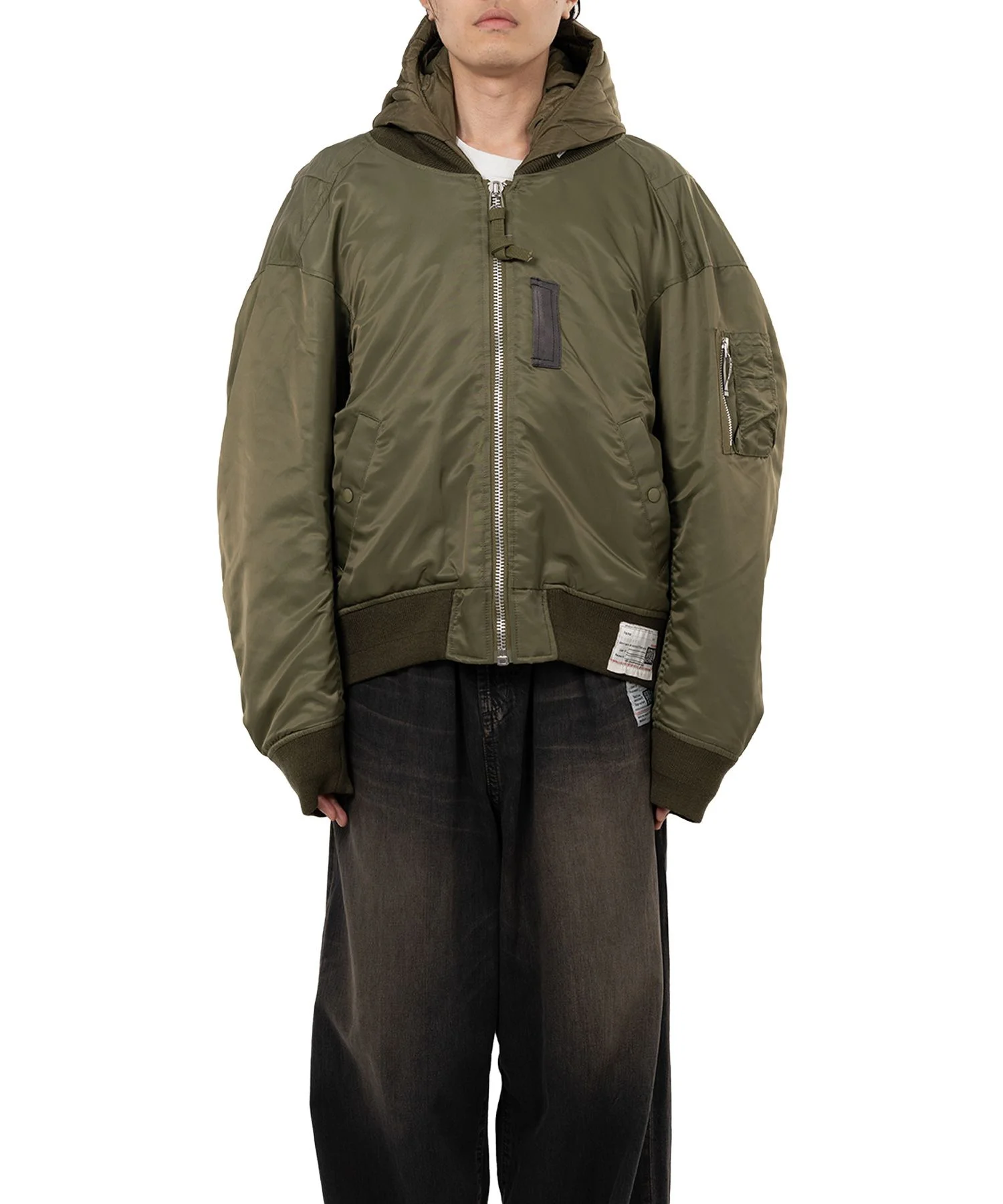 【2025 Autumn/Winter Collection】 Extended Placket Hood Flight Jacket Nylon flight jacket. The jacket's turned-up side extends to form a hood. Zip-up closure. Side and inside pockets. Oversized, wide-back silhouette. Wearing model : 182cm Wearing size : 48 ※Product images may appear different from the actual item due to lighting conditions during photography or variations in monitor settings. ※Some photos feature sample items; actual products may differ slightly in finish or sizing. ※Color, texture, and specifications may vary slightly due to differences in production timing or individual characteristics of each piece. We appreciate your understanding. - Item No: A15BL062 - Brand: Maison MIHARA YASUHIRO - Category: MENS » OUTER » BLOUSON - Season: 2025 A/W - Material: NYLON 100% - Made In: JAPAN