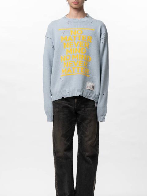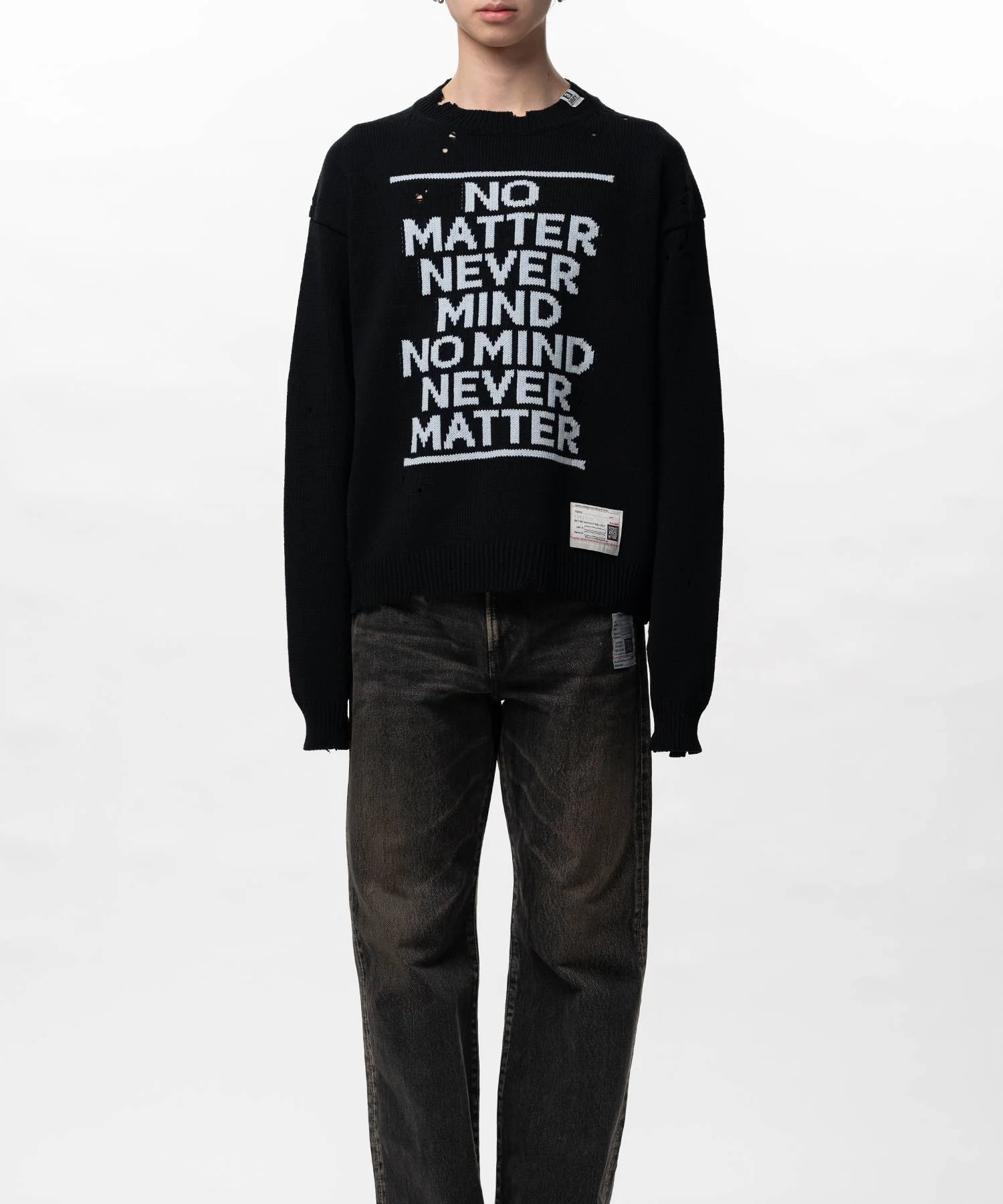 【2026 Spring /Summer Collection】 Message Jacquard Knit Sweater A knit sweater featuring a message motif rendered in jacquard knitting. The hem and cuffs are designed to look as if the knit has unraveled. The entire piece has been distressed. Crew neck. Wearing model : 185cm Wearing size : 46 ※Product images may appear different from the actual item due to lighting conditions during photography or variations in monitor settings. ※Some photos feature sample items; actual products may differ slightly in finish or sizing. ※Color, texture, and specifications may vary slightly due to differences in production timing or individual characteristics of each piece. We appreciate your understanding. ※Intentional distressing such as holes, fading, and staining is part of the design and reflects the character of the item. Please enjoy these features as part of its unique aesthetic. - Item No: A16SW511 - Brand: Maison MIHARA YASUHIRO - Category: MENS » TOPS » KNIT - Season: 2026 S/S - Material: Cotton50%, Acrylic50% - Made In: JAPAN