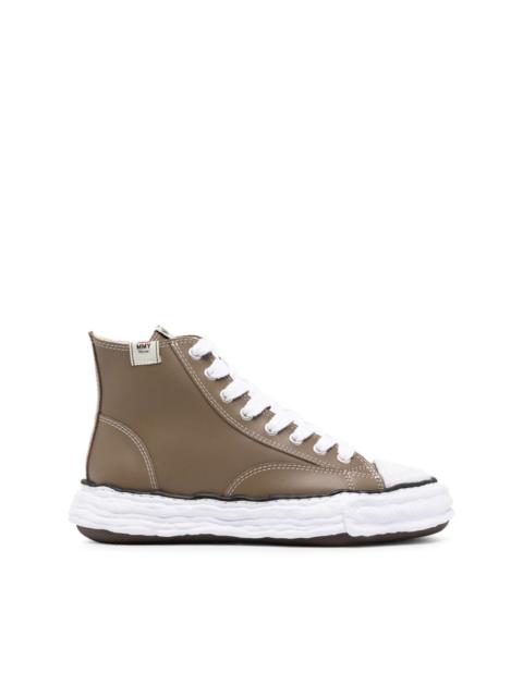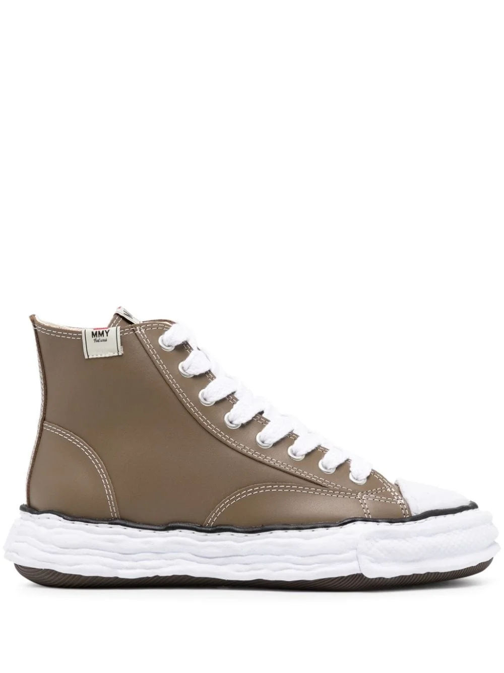 Peterson23 high-top sneakers Maison Mihara Yasuhiro's Peterson23 sneakers are infused with the brand's avant-garde aesthetic just like its predecessor model Peterson. Crafted from leather to a high-top silhouette, they are grounded on the brand's Original Sole, a rubber outsole hand-modelled by namesake designer Mihara Yasuhiro, hence its irregular appearance. Highlights - Light brown - Calf leather - Panelled design - Contrast stitching - Logo patch at the tongue - Round toe - Rubber toecap - Front lace-up fastening - Eyelet vents - Branded insole - Ankle-length - Chunky rubber sole Imported Composition Leather 100% SIZE & FIT Measurement CIRCUMFERENCE 9.44 in(24 cm) HEEL 1.96 in(5 cm) Sole height 1.96 in(5 cm) HEIGHT 6.29 in(16 cm) PLATFORM 1.57 in(4 cm) Washing instructions Do Not Wash/Do Not Dry Clean
