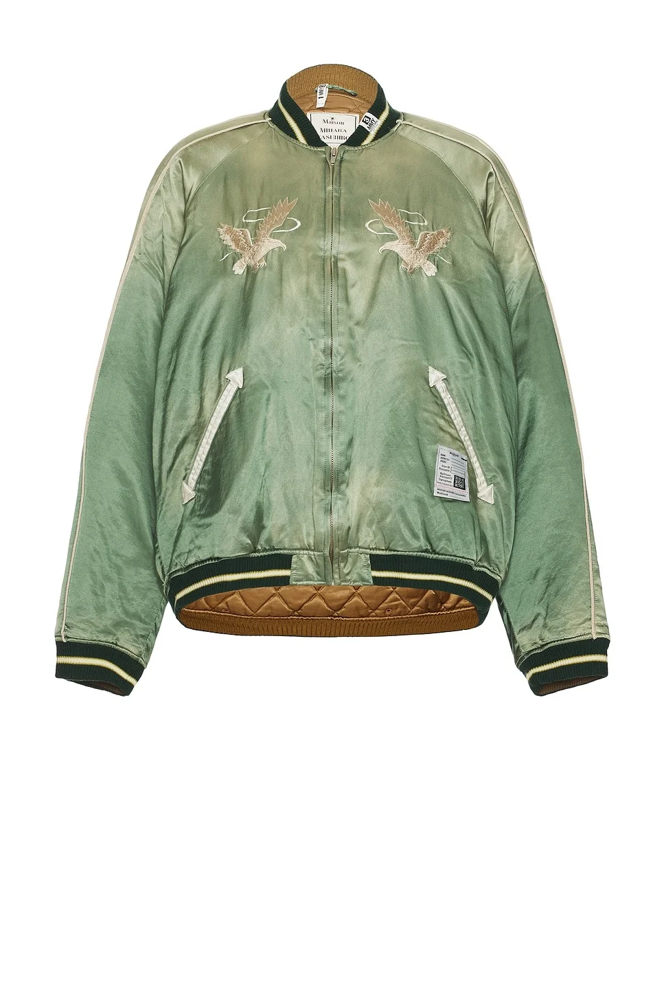 Details - Self & Lining: 58% cotton, 42% rayon - Filling: 100% polyester - Contrast Fabric 1: 100% wool - Contrast Fabric 2: 100% cotton - Made in Japan - Dry clean only - Front zip closure - Front slant pockets - Front and back embroidered design - Elasticized ribbed trim - Heavyweight satin fabric - Our Style No. MUHF-MO7 - Manufacturer Style No. J14BL141