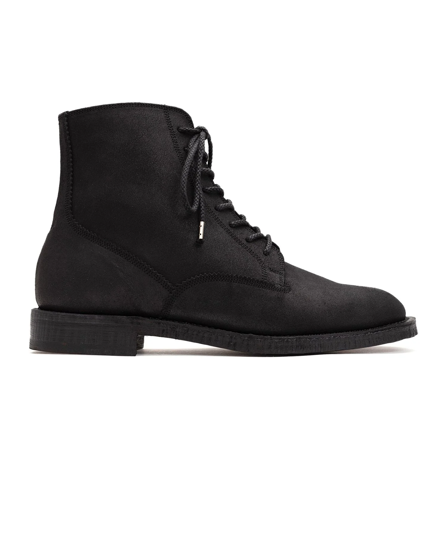 Suede Derby Boots Boots made of full grain velour. Characterized by a delicate keva and a unique softness, and the tips of the suede hair are laid down with an iron to give them a more elegant finish. New wood pattern. Goodyear welt. Short shoes with external blades and plain toe design. The sole is intentionally rough-hewn without a clean finish on the sides, leaving them as a design feature. - Item No: D09FW904 - Brand: Maison MIHARA YASUHIRO - Category: MENS » SHOES » DRESS SHOES - Season: 2023 A/W - Material: UPPER : Cow Leather SOLE : Cow Leather - Made In: JAPAN