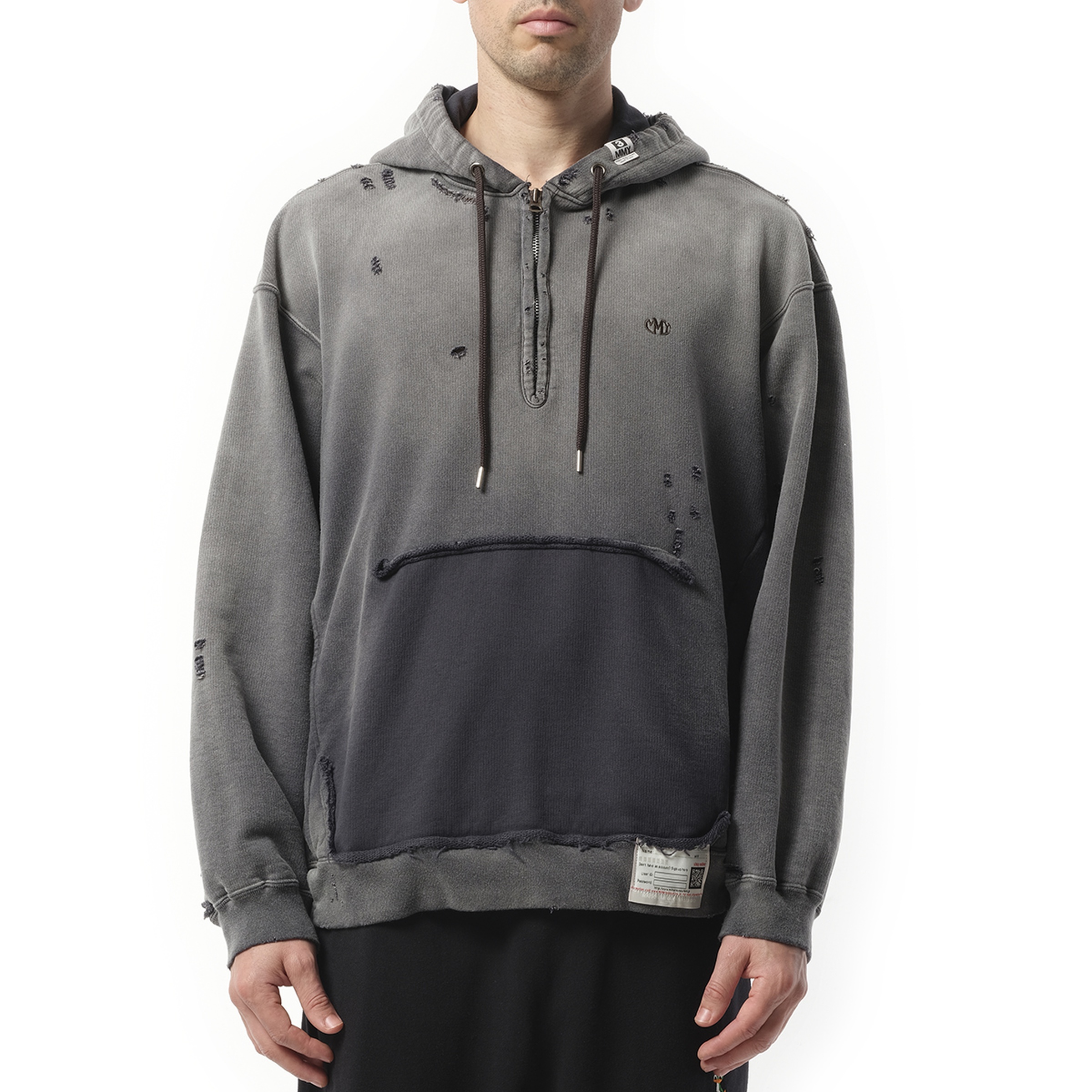 Expertly crafted in a sun-faded black, this half zip hoodie offers both style and functionality. The sun-fading technique adds a unique touch to the classic black color, while the half zip design allows for easy ventilation while on the go. - Composition: 100% Cotton - Faded effect - Front zip fastening - Embroidered logo at the chest - Logo patch to the side - Made in Japan Model is 192 cm and wears size 46 SKU: A14HD532 BK