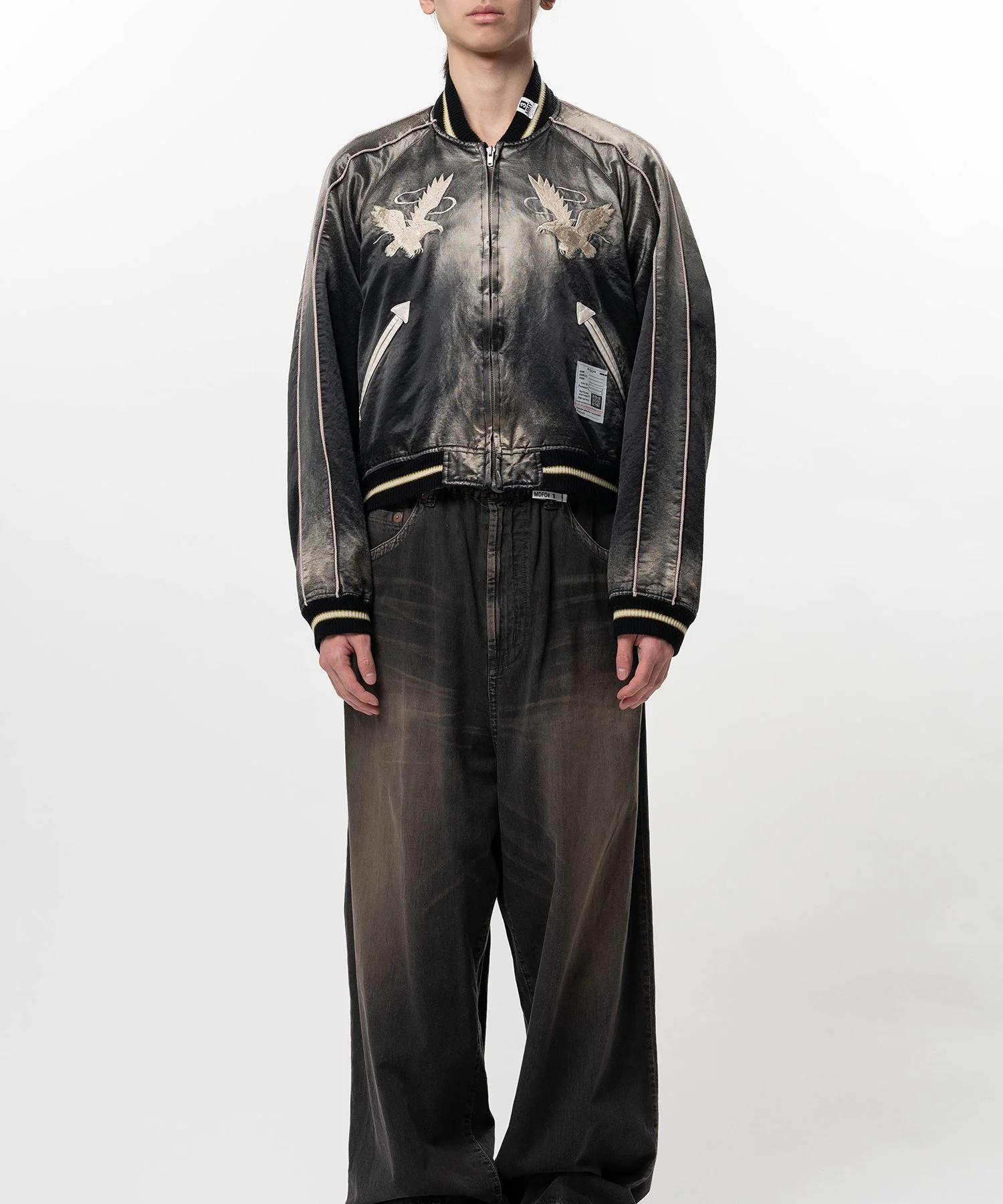 【2026 Spring /Summer Collection】 Sun Faded Like Souvenir Jacket A souvenir jacket with a collar, designed with inspiration from the Yokosuka-born ska jacket. Features “Tokio” embroidered on the back. Front pocket. Longer back length design. Zip-up. Wearing model : 185cm Wearing size : 44 ※Product images may appear different from the actual item due to lighting conditions during photography or variations in monitor settings. ※Some photos feature sample items; actual products may differ slightly in finish or sizing. ※Color, texture, and specifications may vary slightly due to differences in production timing or individual characteristics of each piece. We appreciate your understanding. ※Intentional distressing such as holes, fading, and staining is part of the design and reflects the character of the item. Please enjoy these features as part of its unique aesthetic. - Item No: J16BL141 - Brand: Maison MIHARA YASUHIRO - Category: MENS » OUTER » BLOUSON - Season: 2026 S/S - Material: COTTON70% RAYON 30% - Made In: JAPAN