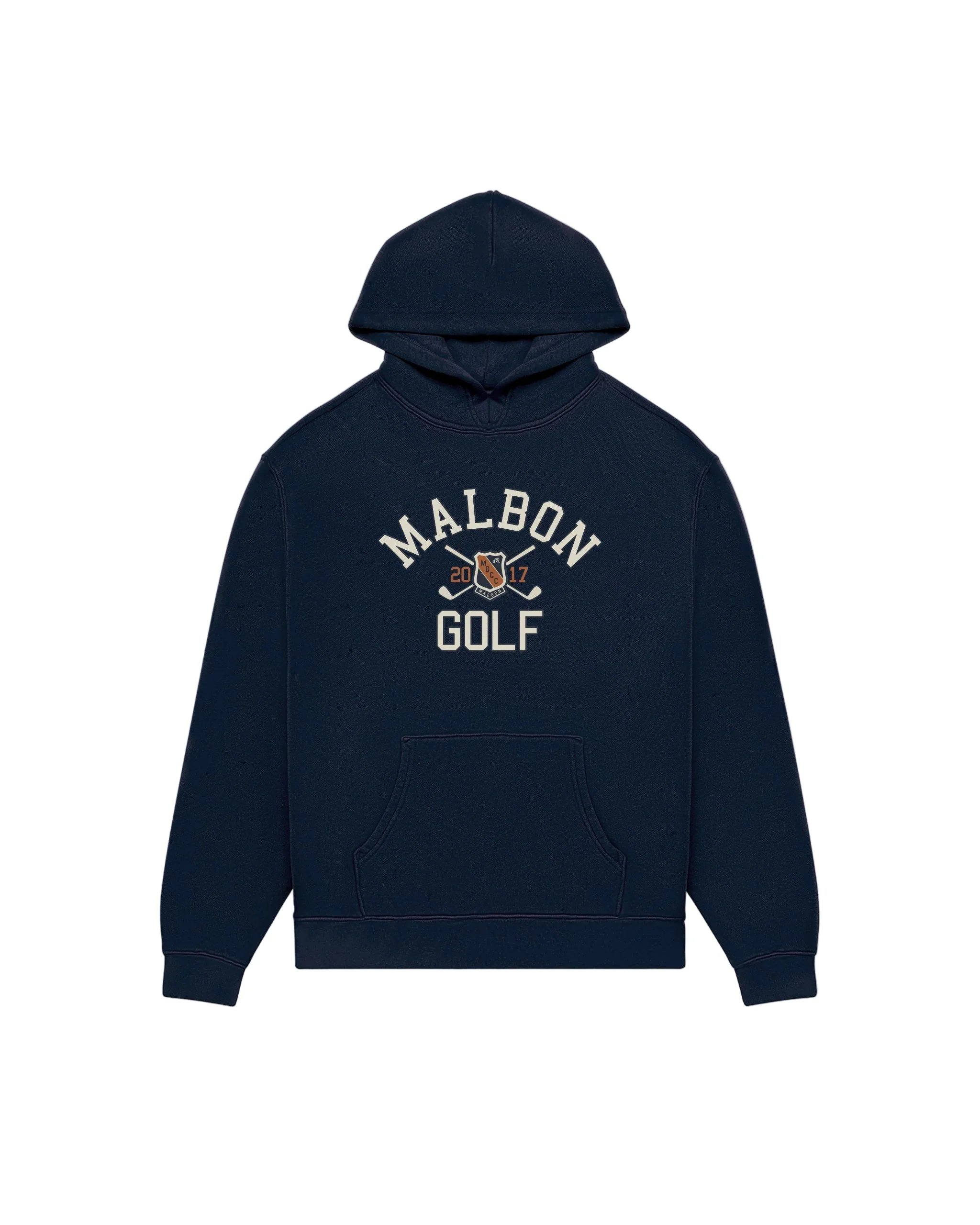 Navy Fesque Crest Hoodie by Malbon, made from 100% cotton. Features a relaxed fit, ribbed cuffs and waistband, front kangaroo pocket, embroidered Malbon Golf applique on the front, and a woven Malbon flag label on the left side.