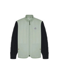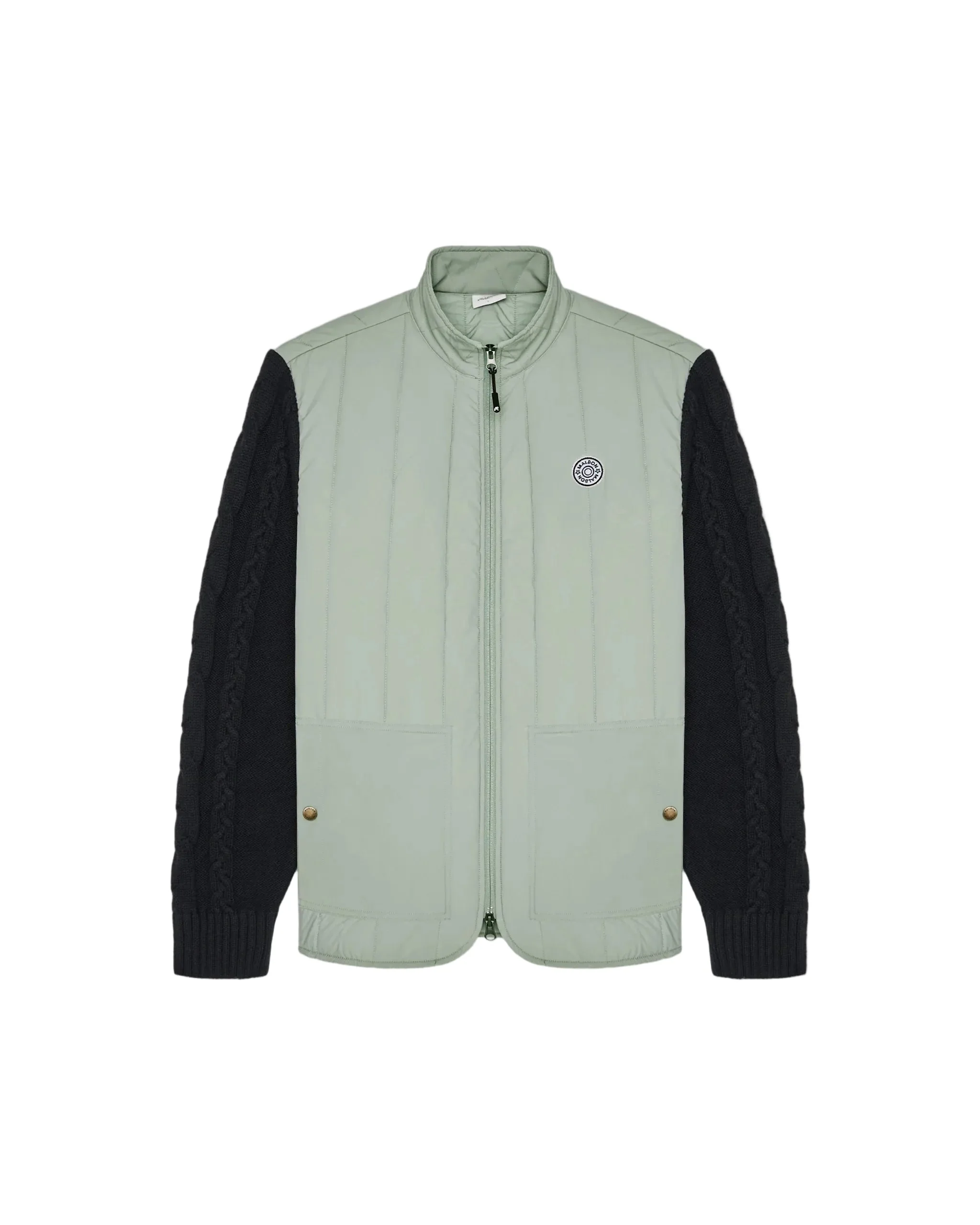 Isle Hybrid Jacket in sea green by Malbon blends a protective polyester shell with textured cable knit sleeves for versatile layering. The relaxed fit features ribbed cuffs, front pockets, and signature Malbon branding on the chest and back. Shell: 100% polyester Sleeve: 100% cotton