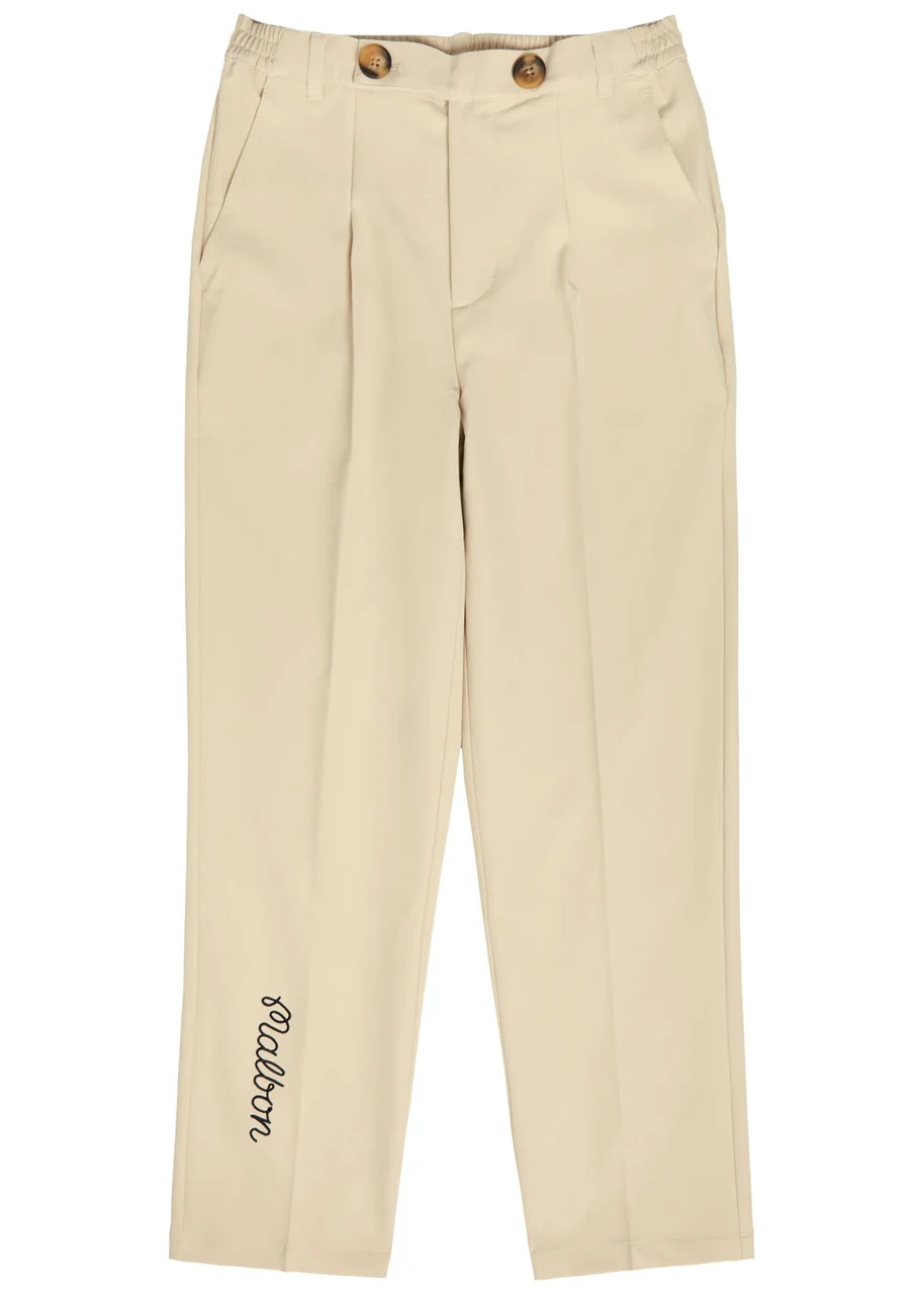 Info & Care Malbon stretch-crepe trousers Belt loops, partially elasticated waistband, side slip pockets, pleats at front, pressed crease through legs, embroidered logo,;designer tag at back, button-fastening back slit pockets,; Partially concealed zip, button and hook fastening at front 88% polyester, 12% elastane Machine wash Size & Fit Inside leg length: 29.5 inches/ 75.5cm Midweight Relaxed straight-leg cut Model is 6'1"/ 185cm and wears a size medium