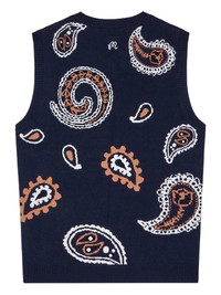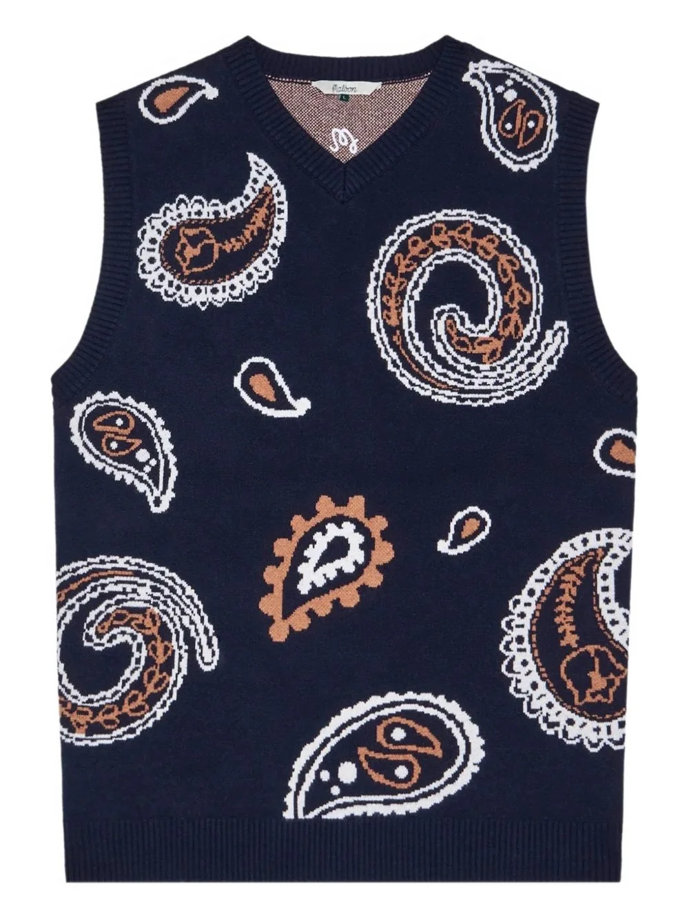 V-neck sweater vest Highlights - Navy blue - Paisley print - Sleeveless - Ribbed hem - Ribbed v-neck - Ribbed armholes Imported Composition Cotton 60%, Nylon 30%, Wool 10% Washing instructions Read Manufacturer Guidelines